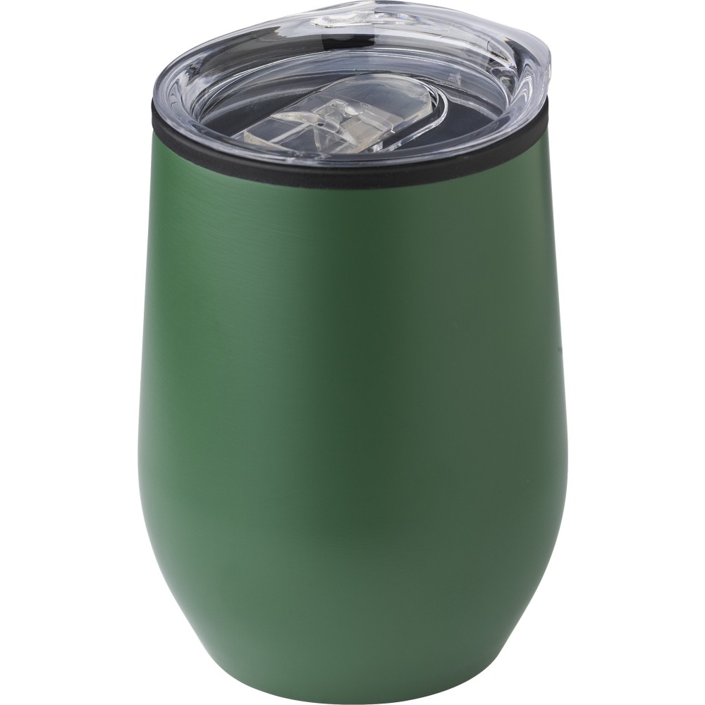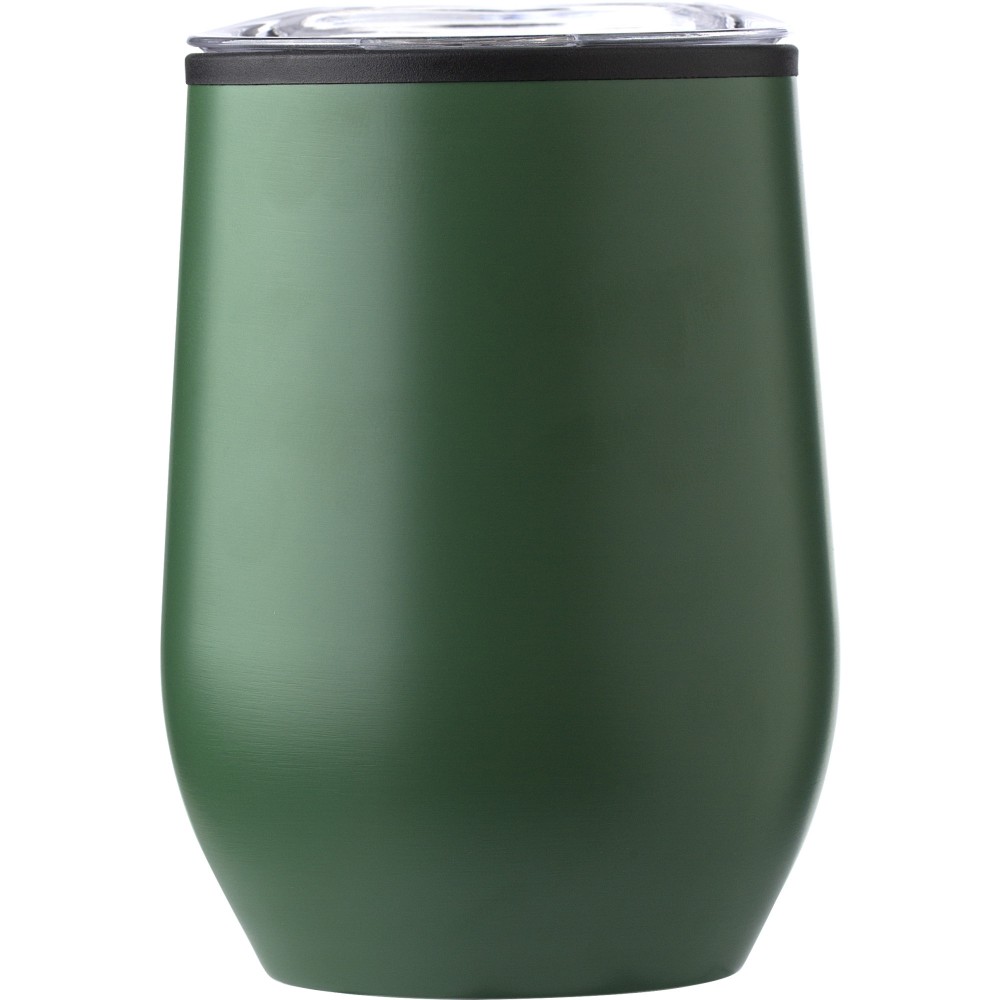 Rozsdamentes acél utazópohár PP belsővel és PS tetővel. A bögre matt felületű. Barna kartondobozba egyedileg csomagolva. Űrtartalom: 300 ml.
