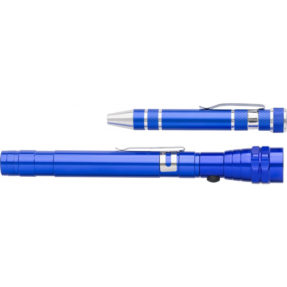 Teleszkópos elemlámpa 3 LED fénnyel és egy toll formájú csavarhúzószett 3 db laposfejű csavarhúzóval és 4 db Phillips csavarfejjel. Csomagolás fekete ajándékdobozban.