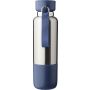 Duplafalú rozsdamentes acél kulacs, 500 ml-es. 304-es rozsdamentes acél belsővel és 201-es rozsdamentes acél külsővel. Átlátszó rekesszel ellátott PP csavaros kupakkal, cserélhető poliészter csuklópánttal, valamint egy 200 ml-es PP pohárral az alján. Ezüst színű felület matt részletekkel. Csomagolása barna papírdoboz.