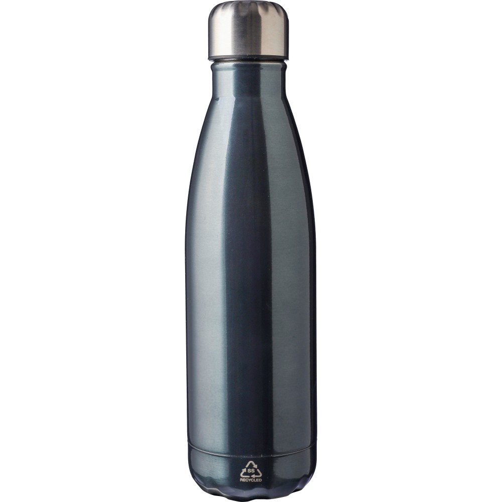 Újrahasznosított rozsdamentes acél, egyrétegű kulacs csavaros kupakkal. 304-es rozsdamentes acélból készült. Az újrahasznosított logó gravírozva van a kulacson. Egyenként barna kartondobozba csomagolva. Űrtartalom: 650 ml.