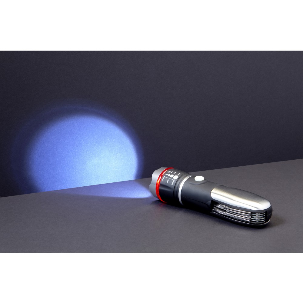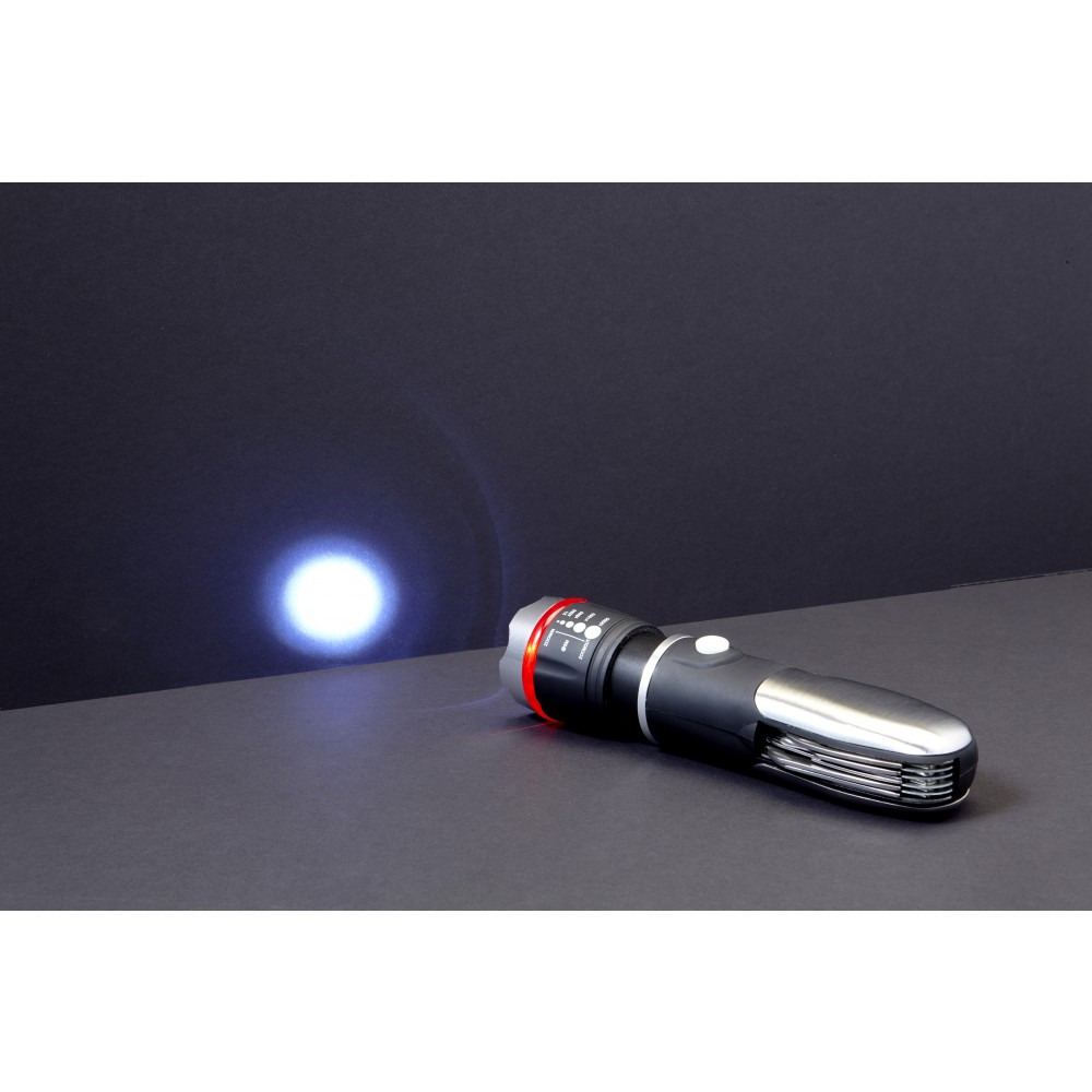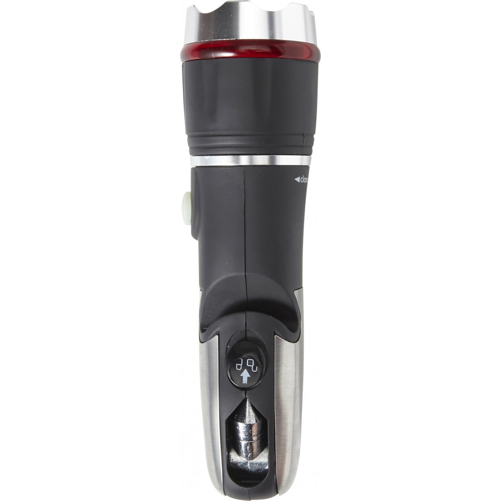Lámpa biztonságiöv-vágóval, vészkalapáccsal. Az alsó részben kivehető zsebkés teszi igazán multifunkcióssá ezt az eszközt. Az elemet tartalmazza. Fém.