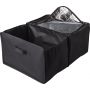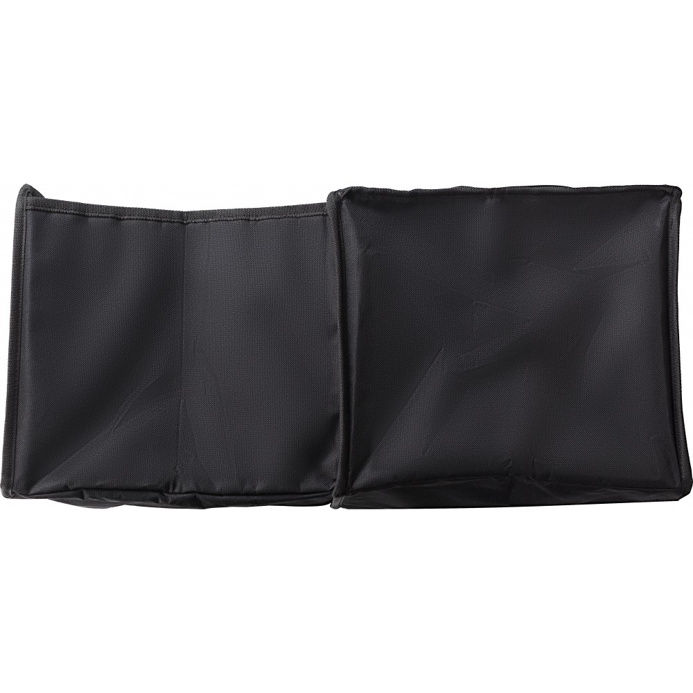 Autós rendező. Két rekesz, amelyből az egyik egy cipzárral zárható hűtőtáska alu szigeteléssel. Laposra hajtogatható. 600D poliészter.