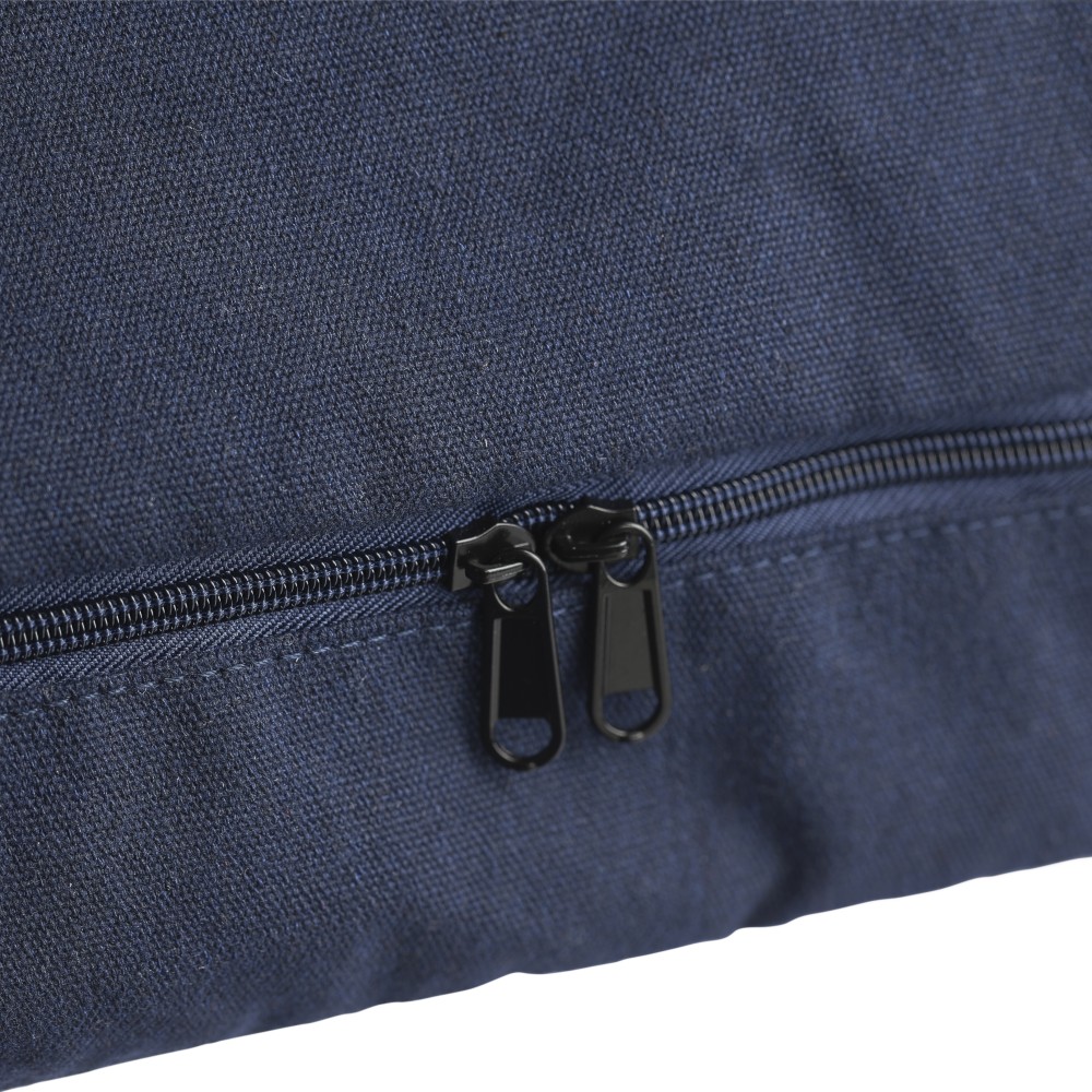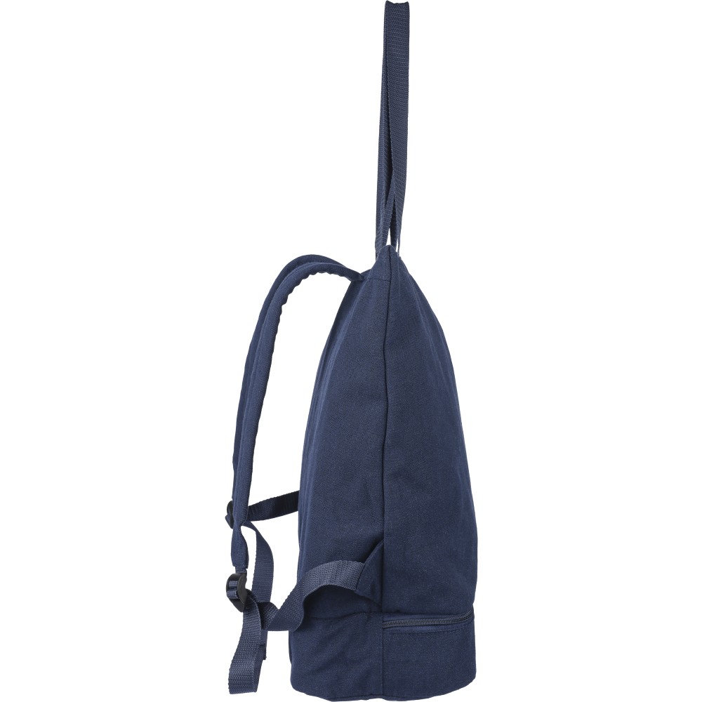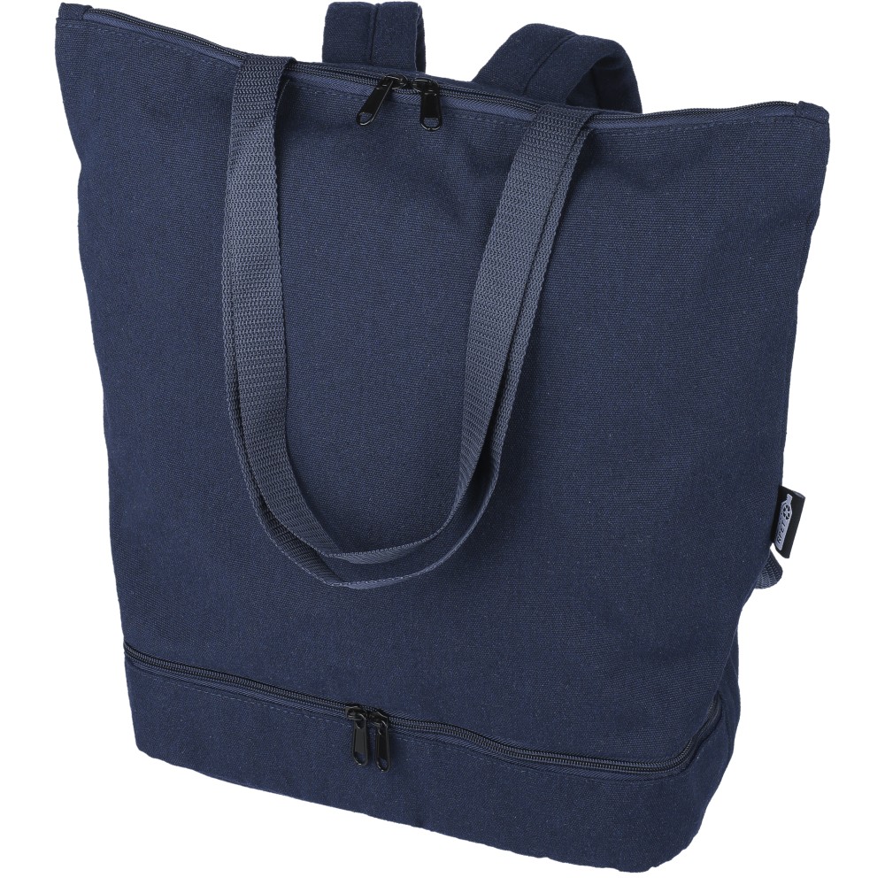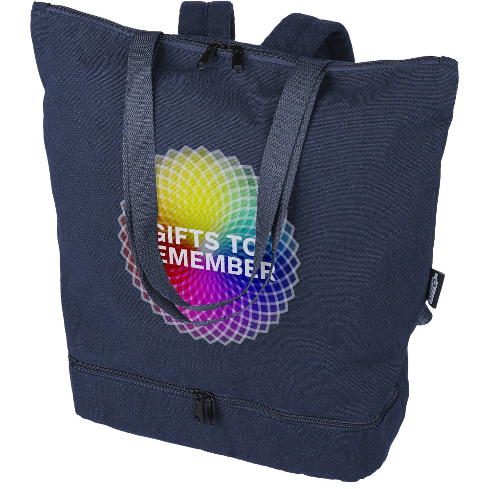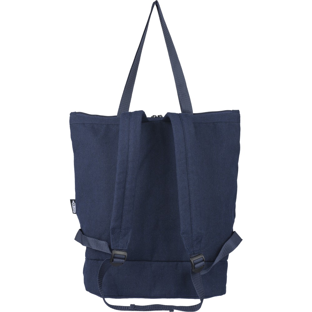 Bevásárlótáska és hátizsák 330 g/m2 újahasznosított policotton anyagból, 210D poliészter béléssel. Egy nagy cipzáras rekesszel a tetején, cipzáras rekesszel az alján, 15 -es laptoptartó résszel, két belső rekesszel és egy külső cipzáras résszel. Hordozófüllel és párnázott, állítható vállpánttal. Űrtartalom: 30 liter, teherbíró képesség: 15 kg. Címkét tartalmaz.