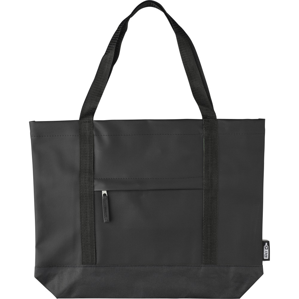 600D rPET poliészter bevásárlótáska. Mindkét oldalon PU bevonat teszi vízlepergetővé. Első cipzáras zsebbel, kicsi, belső cipzáras zsebbel és hosszú hordozófüllel. Kapacitása 10 liter. Oldalán rPET címkével.