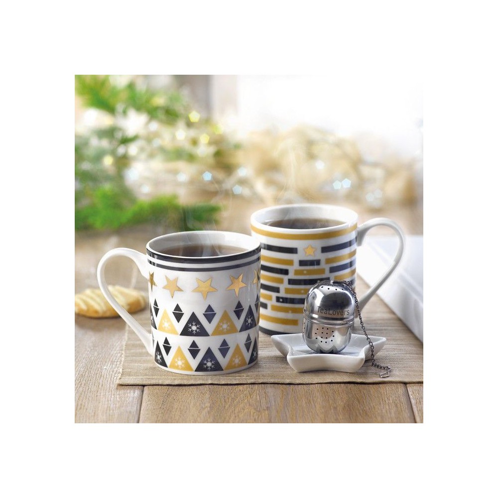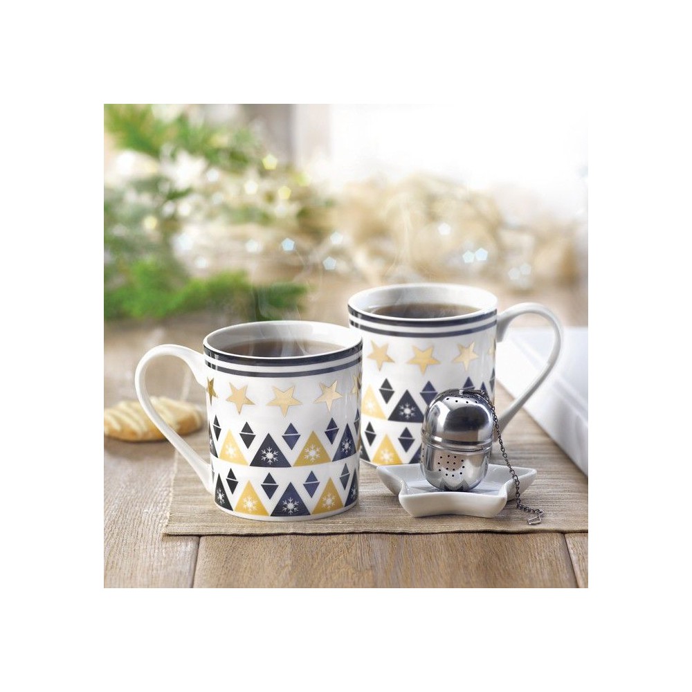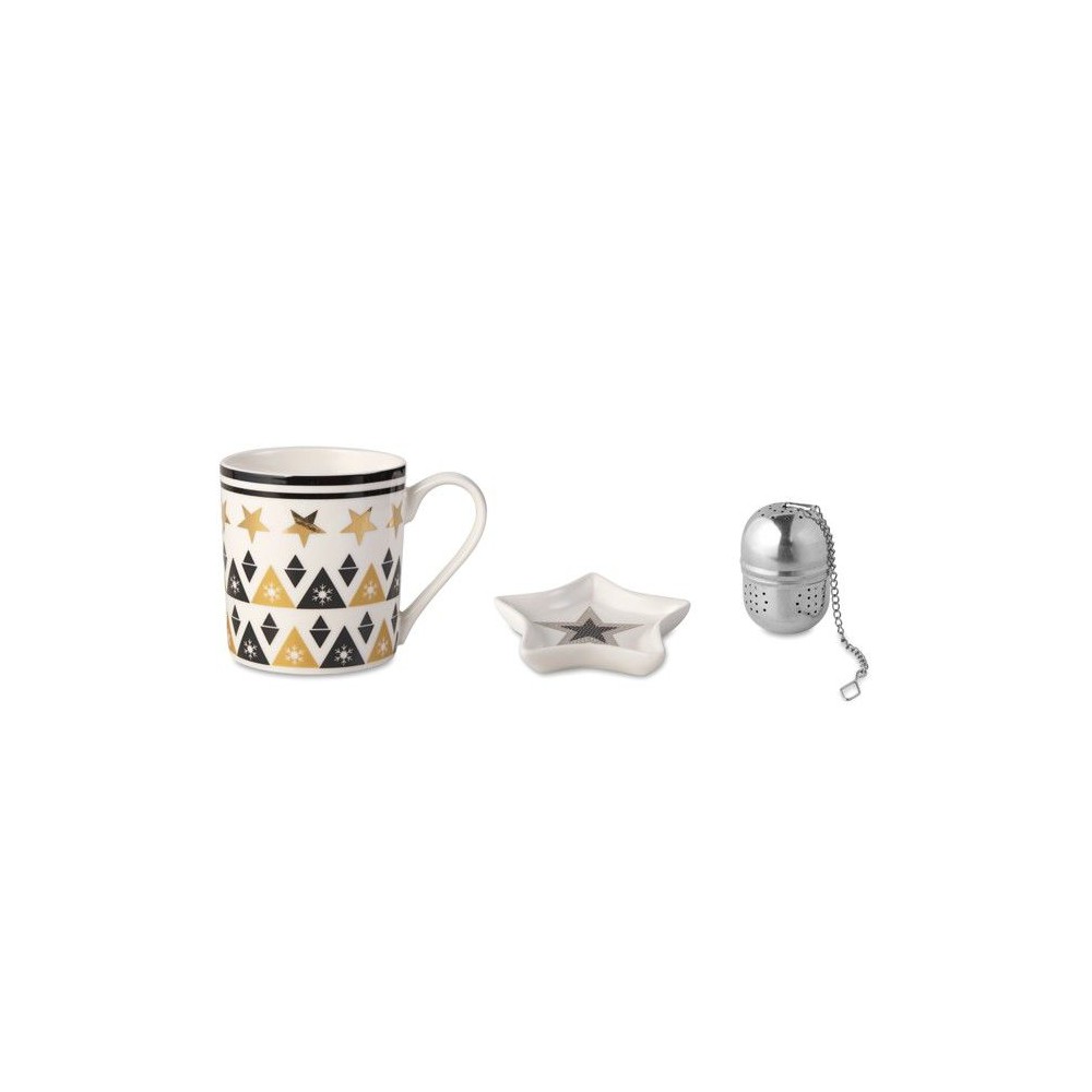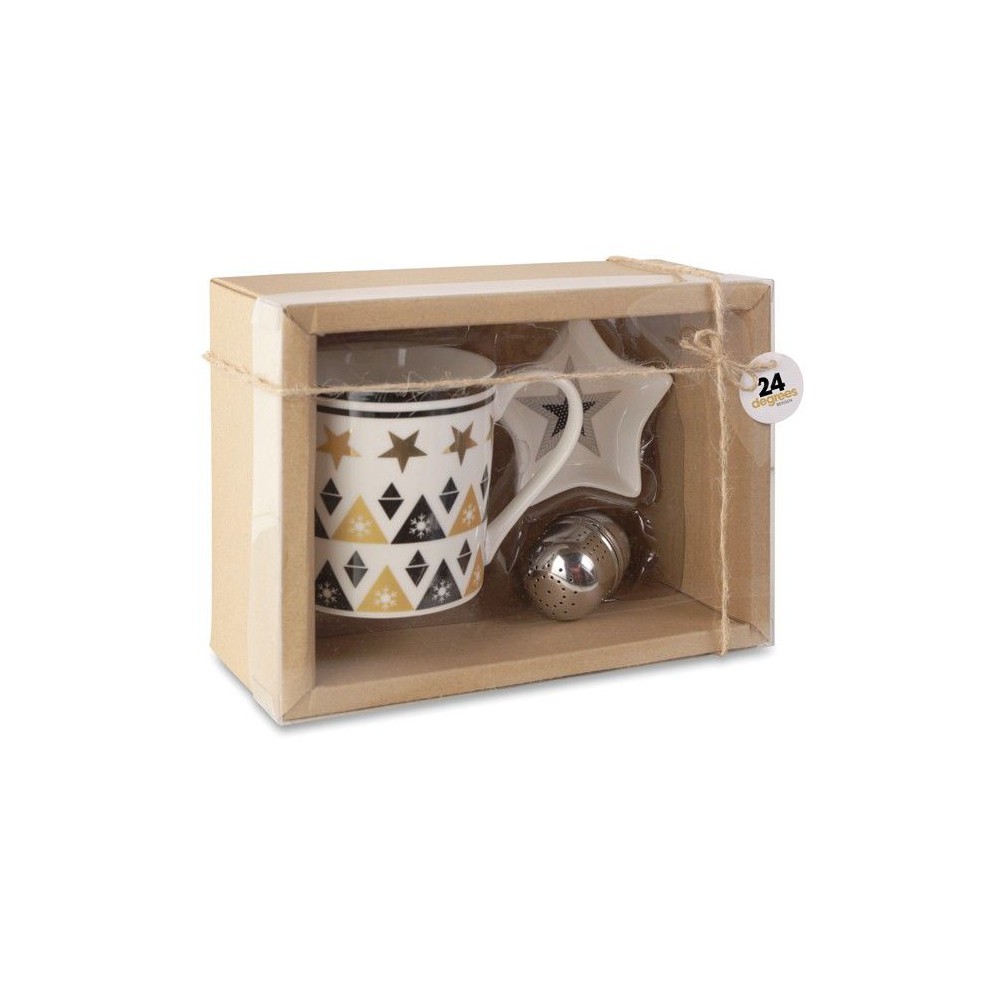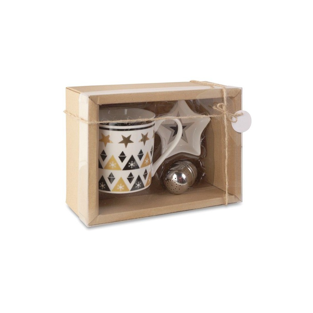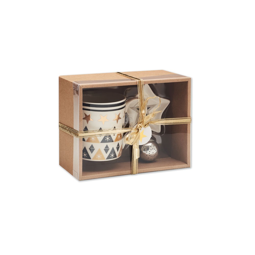 Szett kerámia bögrével, teatojással és mini tányérral. Kartondobozban PVC borítóval és kártyával ellátott zsinórral.