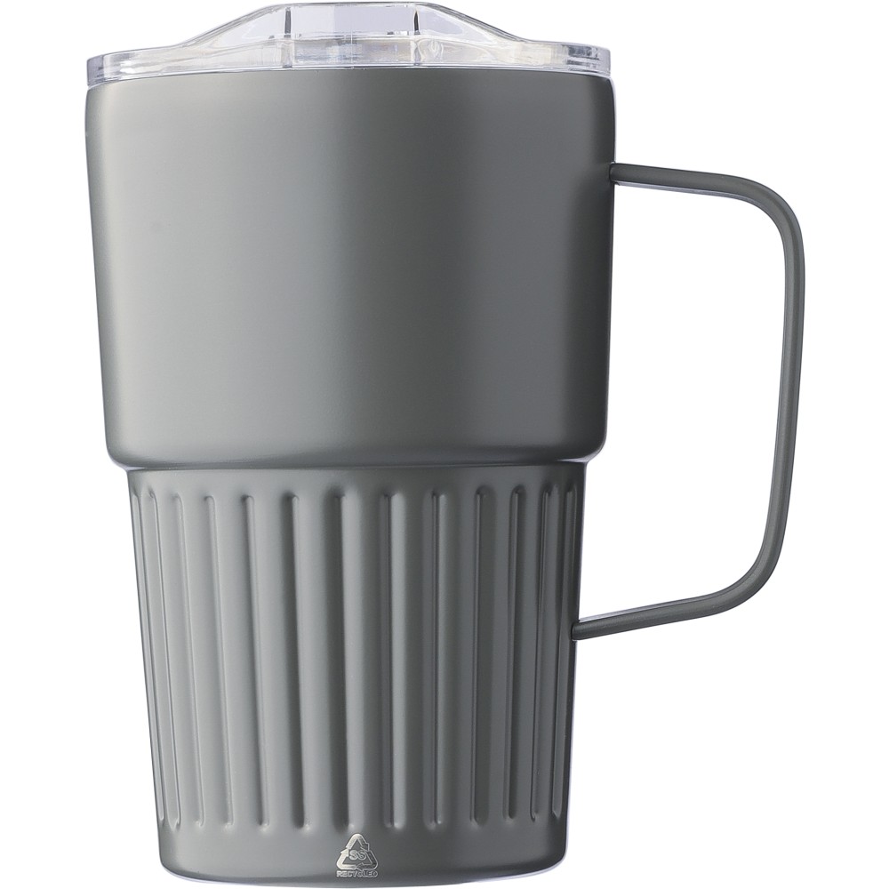 Újrahasznosított rozsdamentes acél útibögre, 450 ml. A belső 304-es, a külső 201-es rozsdamentes acélból készült, bordás markolattal és masszív fogantyúval, műanyag, csúszózáras fedéllel. Gravírozott újrahasznosított logó található a bögrén. Csomagolása barna papírdoboz.