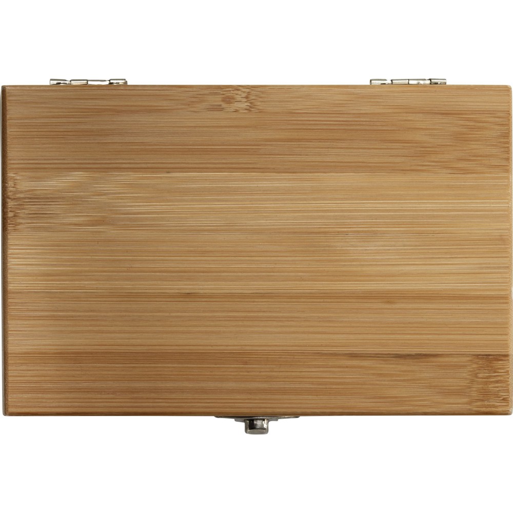 Boroskészlet. Tartalma: pincérbicska, üvegdugó, cseppfogó. Csomagolása bambusz díszdoboz. Bambusz és BPA-mentes műanyag.