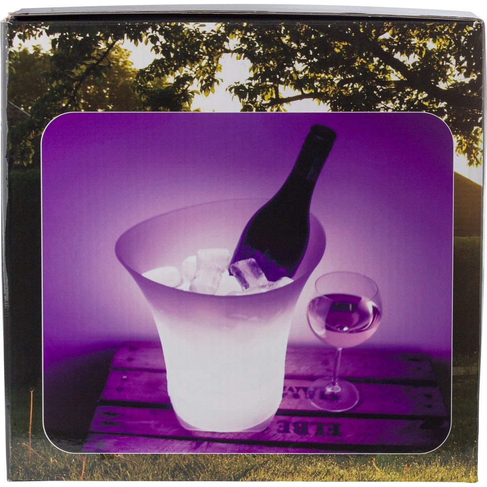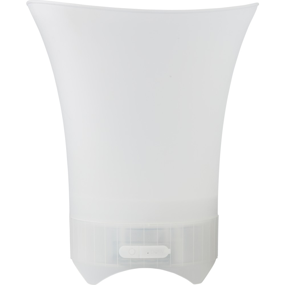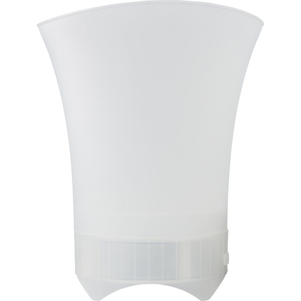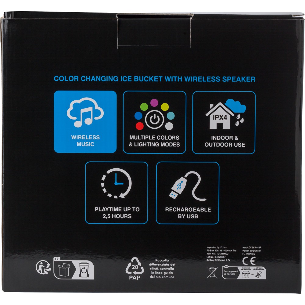 ABS jegesvödör hangszóróval. Színváltó fények az alján és vezeték nélküli technológia. 1200 mAh kapacitású akkumulátor. Darabonként színes díszdobozba csomagolva érkezik.