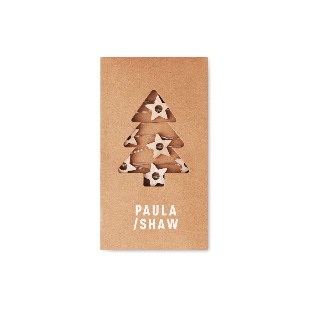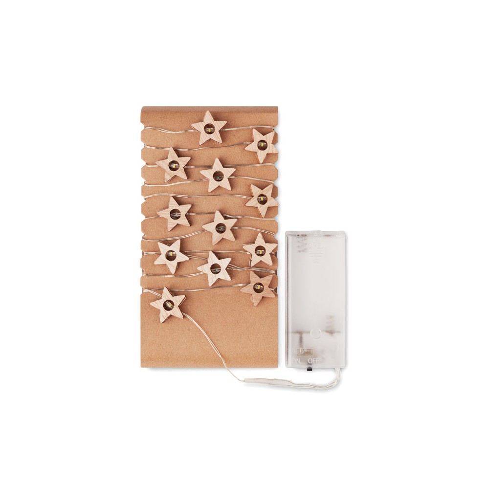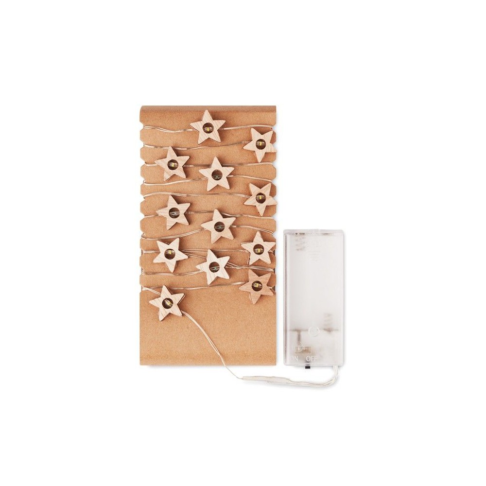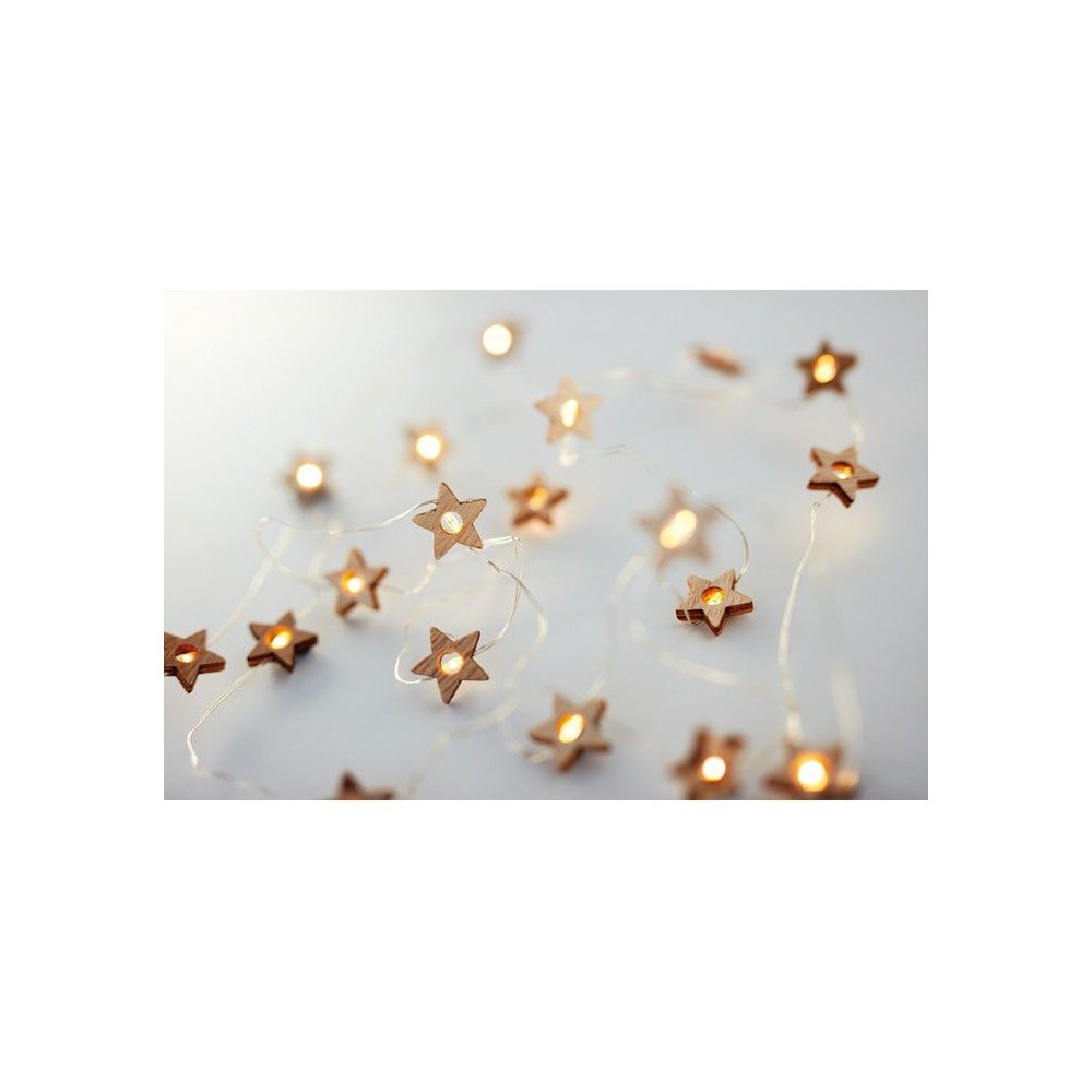 Fából készült, csillag alakú fényfüzér 20 LED fénnyel. Karton dobozban szállítjuk. 2 db AA elemmel működik, elem nélkül szállítjuk. A ki-be kapcsoló gomb az elemtartó tokon található.