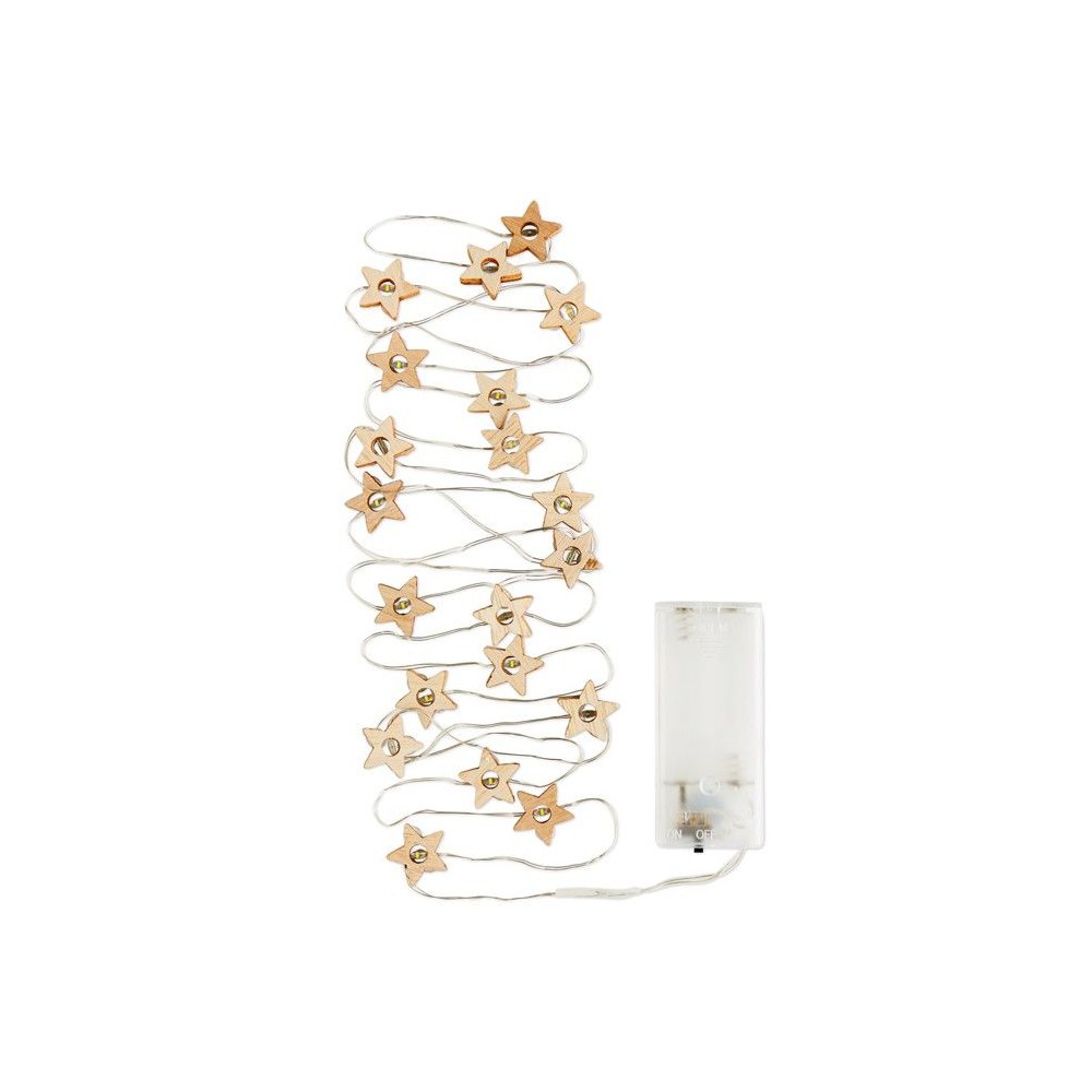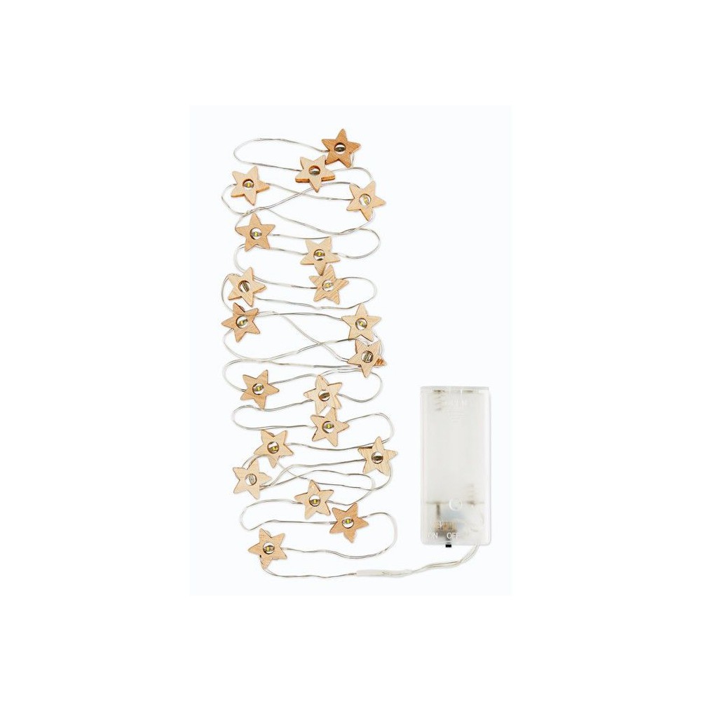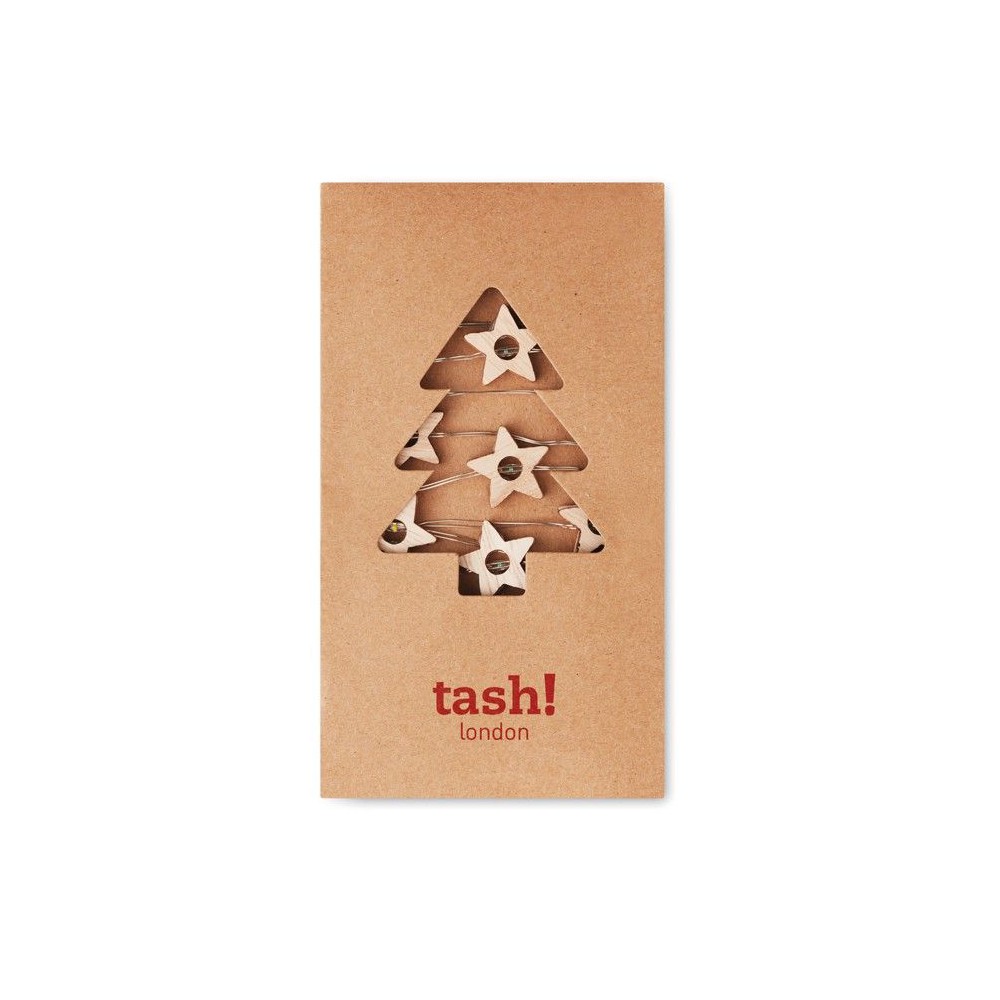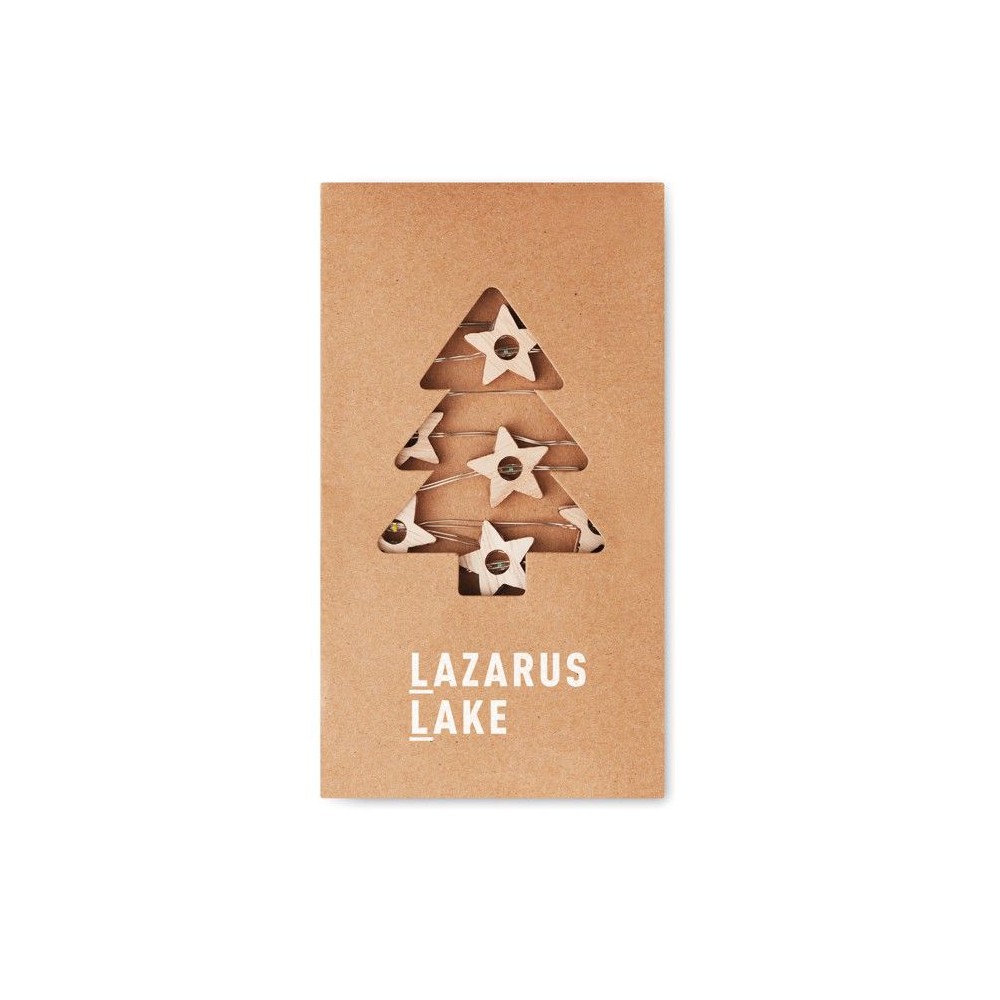 Fából készült, csillag alakú fényfüzér 20 LED fénnyel. Karton dobozban szállítjuk. 2 db AA elemmel működik, elem nélkül szállítjuk. A ki-be kapcsoló gomb az elemtartó tokon található.