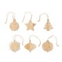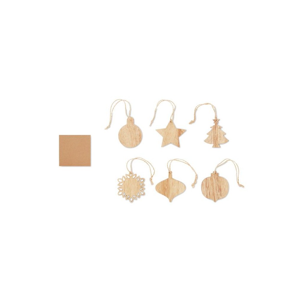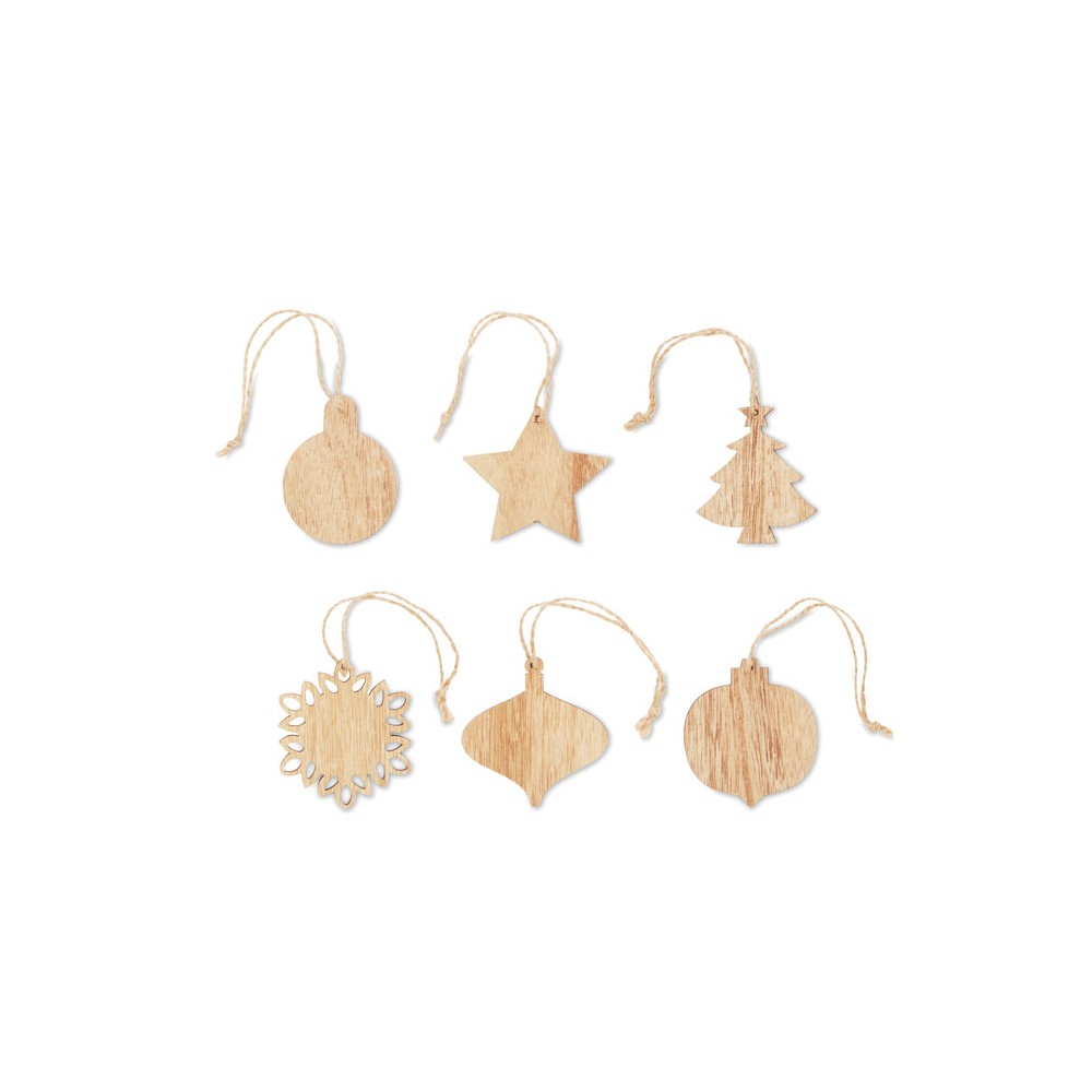 6 darabos, bükkfából készült, juta zsinóros karácsonyfadísz készlet. Fenyőfa, hópehely, és különféle függődísz formákkal. Kraftpapír dobozban szállítjuk.