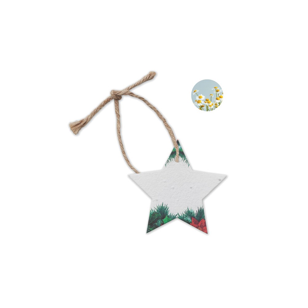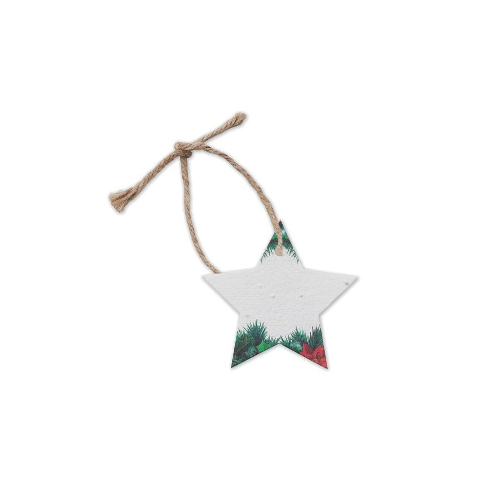 Csillag alakú, magpapír karácsonyi függődísz, vadvirág magkeverékkel, juta zsinórral. Használat után elültetve a magvakból vadvirágok hajtanak ki. EU-ban gyártva.