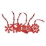 6 db különböző formájú piros karácsonyfadísz filc anyagból: fenyőfa, hópehely, harang, csizma, mikulásvirág és rénszarvas.