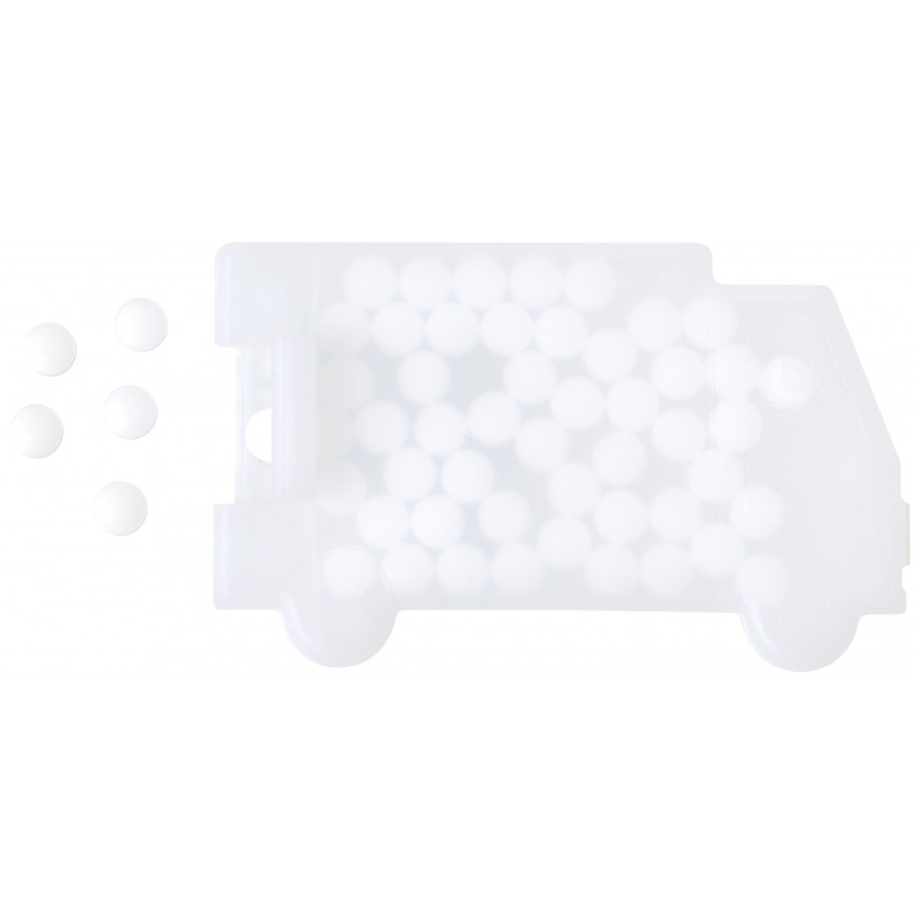 Teherautó alakú cukorka. 5,5 g cukormentes mentolos cukorkát tartalmaz.