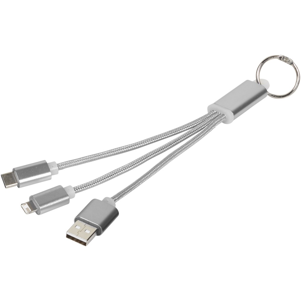 3in1 töltőkulcstartó C és A típusú USB kábellel, és 2in1 töltőcsatlakozóval iOS és Android készülékek számára. Alumínium.