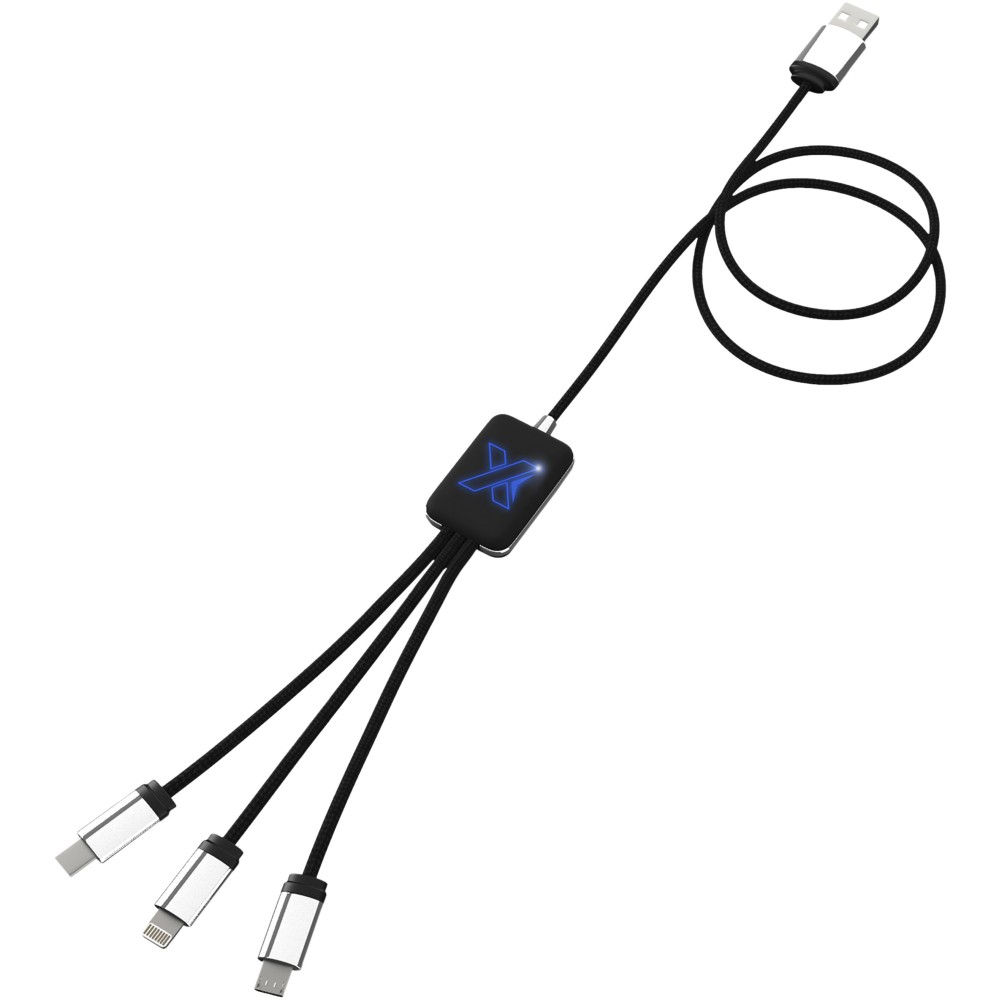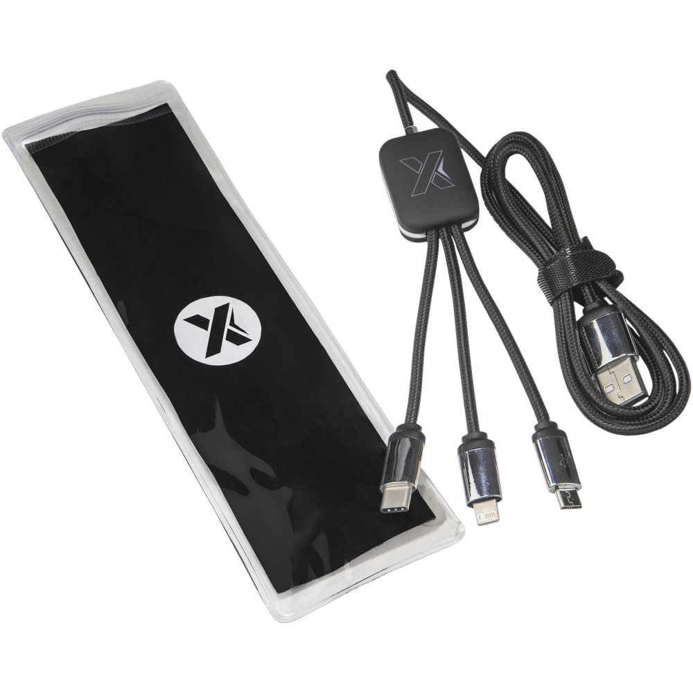 Világító logós töltőkábel gumi és fém bevonattal, három csatlakozóval (Type-C, Android, iPhone). Egyszerre akár három készülék is tölthető. Kábelek hossza (dugókkal együtt): 10 cm. Teljes kábelhossz: 1 méter. Az újrahasznosított PET műanyag kábel és csomagolás újrahasznosított papírból és újrahasznosított műanyagból készül.