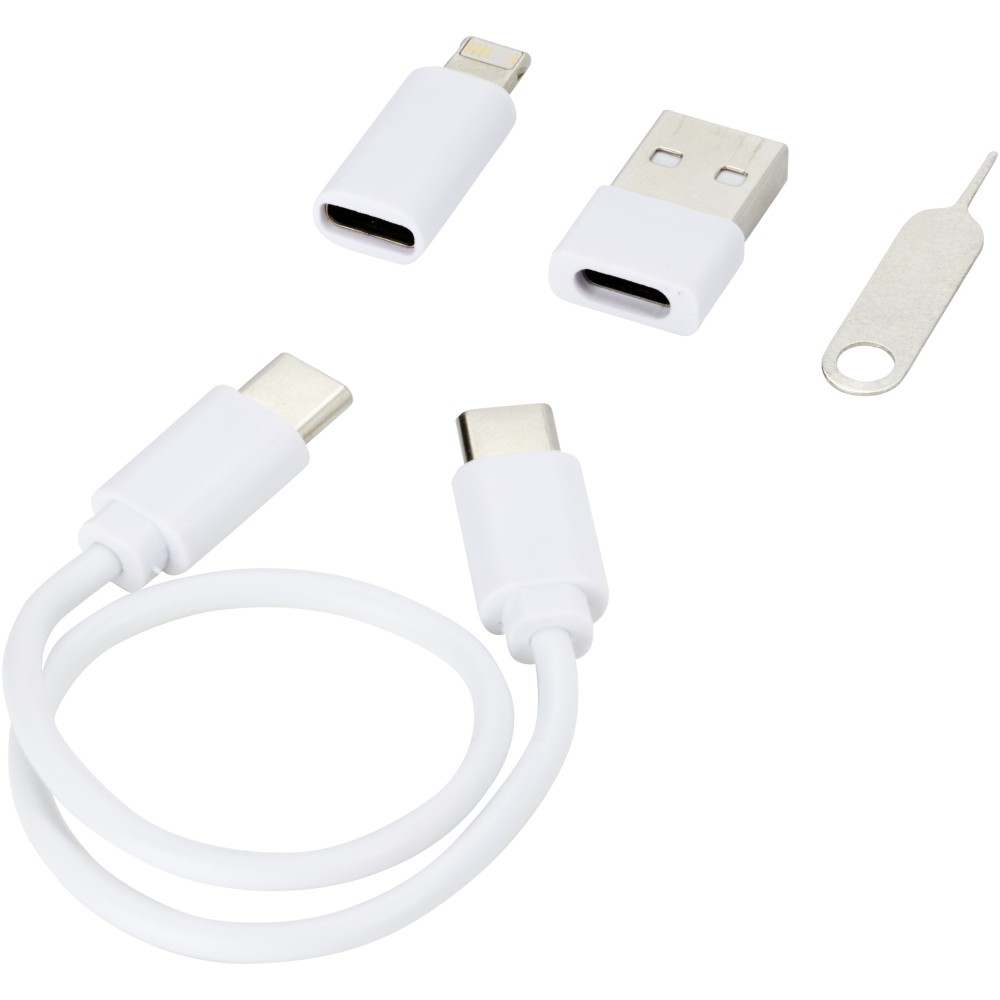 Újrahasznosított műanyagból készült moduláris adat- és töltőkábel, amelyet egy elegáns, telefonállványként is használható tárolódobozba csomagoltunk. A kábel többféle töltési megoldást kínál: C-típusú és USB-A bemenetet, valamint C-típusú/iOS/mikroUSB kimenetet. Mindezen adaptereknek és csatlakozóknak köszönhetően ez a kábel lehetővé teszi a legtöbb okostelefon, fényképezőgép, powerbank, fülhallgató, stb. töltését. A kábel maximális kimeneti teljesítménye 2A. Rendelkezik egy SIM tűvel, amely bármikor jól jön, amikor ki kell venned telefonod SIM-kártyáját. A tárolódobozban egy micro SD memóriakártya, valamint egy nano SIM-kártya tárolására is van hely, így ez a tökéletes utazási kiegészítő. Kábel hossza: 26 cm. 100%-ban újrahasznosított borítékban szállítjuk.
