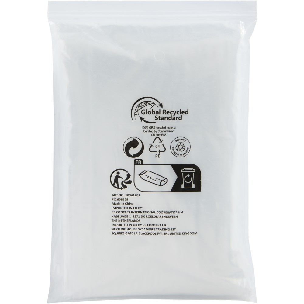 A Maya eldobható esőponcsó 100%-ban újrahasznosított műanyagból készült. Ez az átlátszó, kapucnis poncsó ideális, ha egy szabadtéri fesztiválon vagy bármilyen más szabadtéri rendezvényen elkapja az eső. Nyomtatásra alkalmas tasakkal szállítjuk. Méret: 90 x 120 cm.