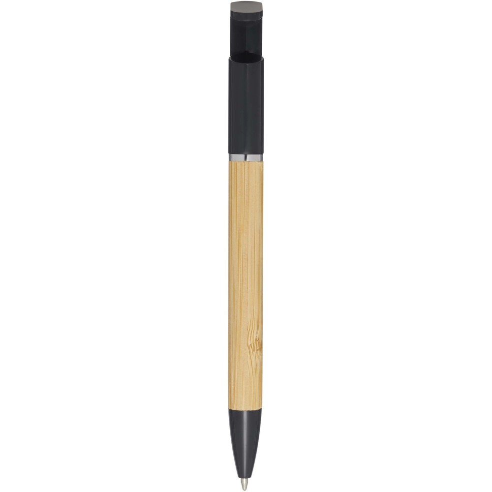 Bambusz golyóstoll, amely telefontartóként is funkcionál. A gomb és a középső gyűrű újrahasznosított műanyagból, a hegy rézből, a tollteste pedig felelősen beszerzett bambuszból készült. Kék tollbetéttel. Írási hossz: 1000 méter. Tollhegy mérete: 1,0 mm.