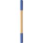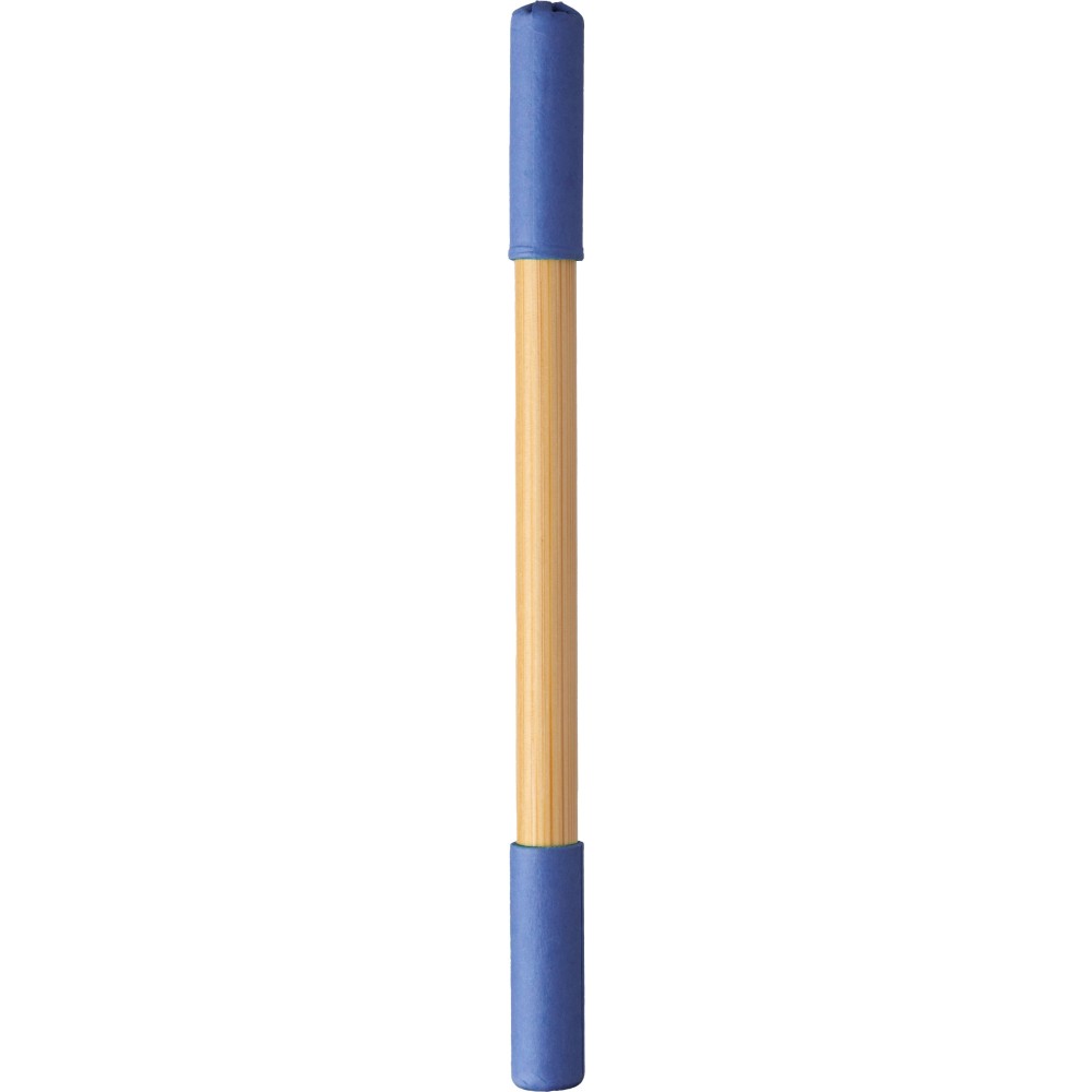 Bambusz végtelenített ceruza és golyóstoll. Az egyik oldalon végtelenített ceruza, a másikon golyóstoll, mindkettő színes karton kupakkal. Kék tollbetéttel.