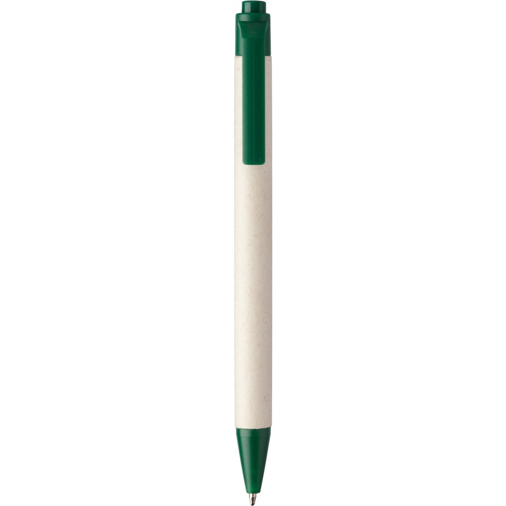 Újrahasznosított tejes kartonból készült golyóstoll újrahasznosított ABS műanyag részekkel. Újrahasznosított ABS logó és újrahasznosított tejes karton logó jelzi a felhasznált anyagok milyenségét. Kék tollbetéttel.