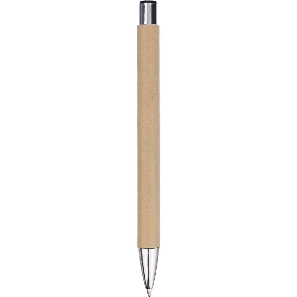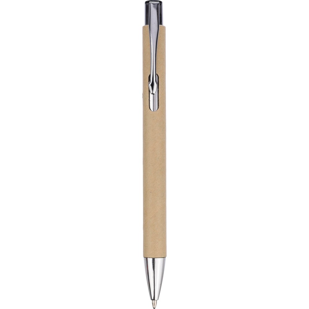 Újrahasznosított kartonból készült golyóstoll krómozott részletekkel. Műanyag tollhegy és nyomógomb, fém klipsz. Kb. 800 méter íráshossz. Fekete tollbetéttel.