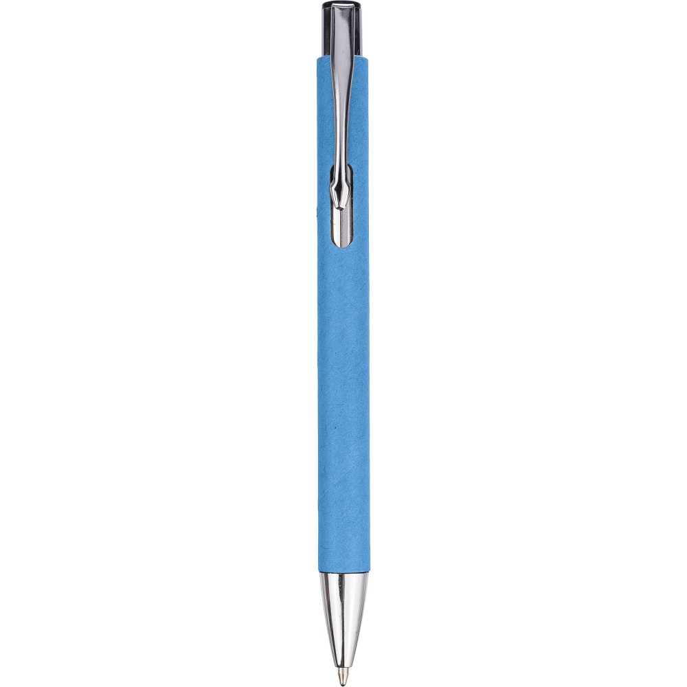 Újrahasznosított kartonból készült golyóstoll krómozott részletekkel. Műanyag tollhegy és nyomógomb, fém klipsz. Kb. 800 méter íráshossz. Fekete tollbetéttel.