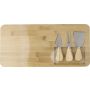 Bambusz vágódeszka három sajtvágó eszközzel, amelyek a deszkán lévő kivágások belsejébe illeszkednek. Csomagolása barna kartondoboz.