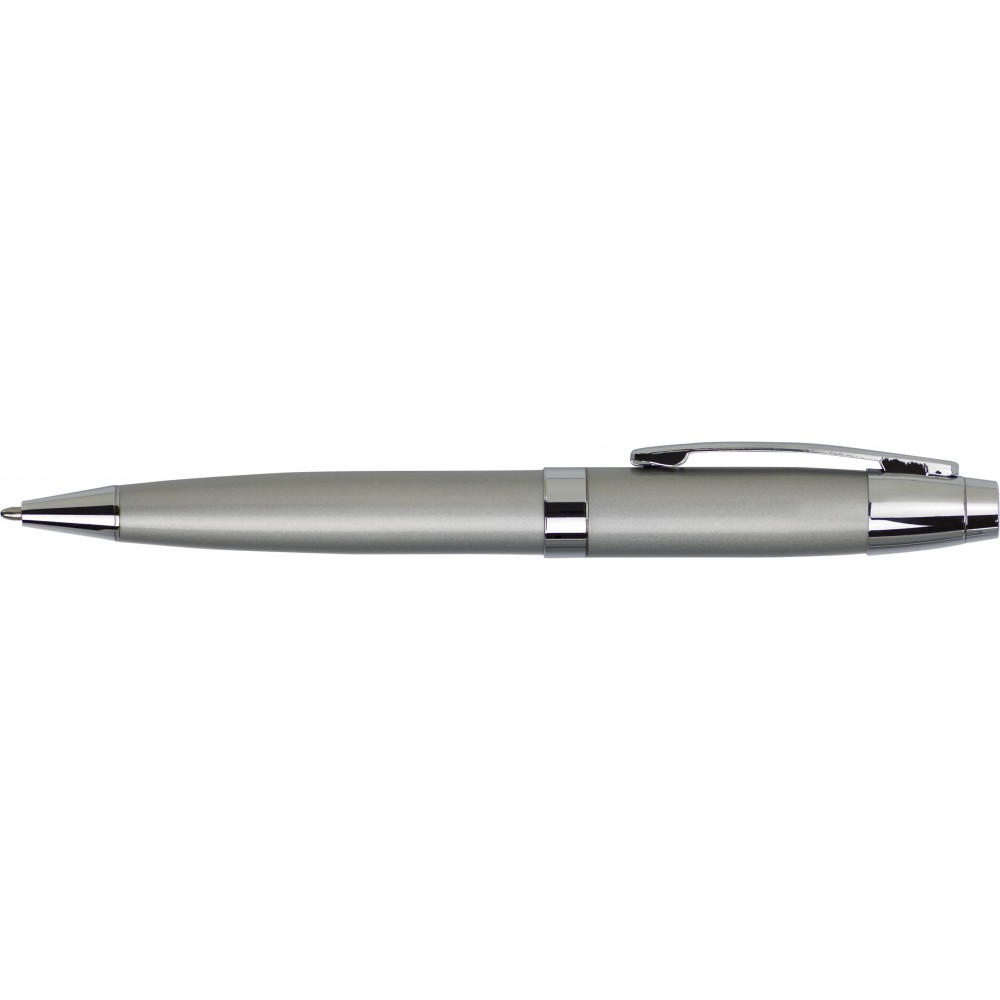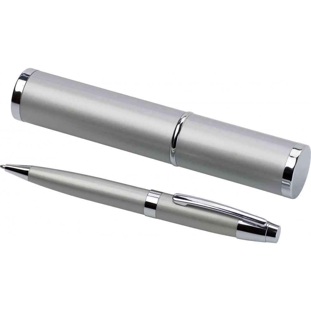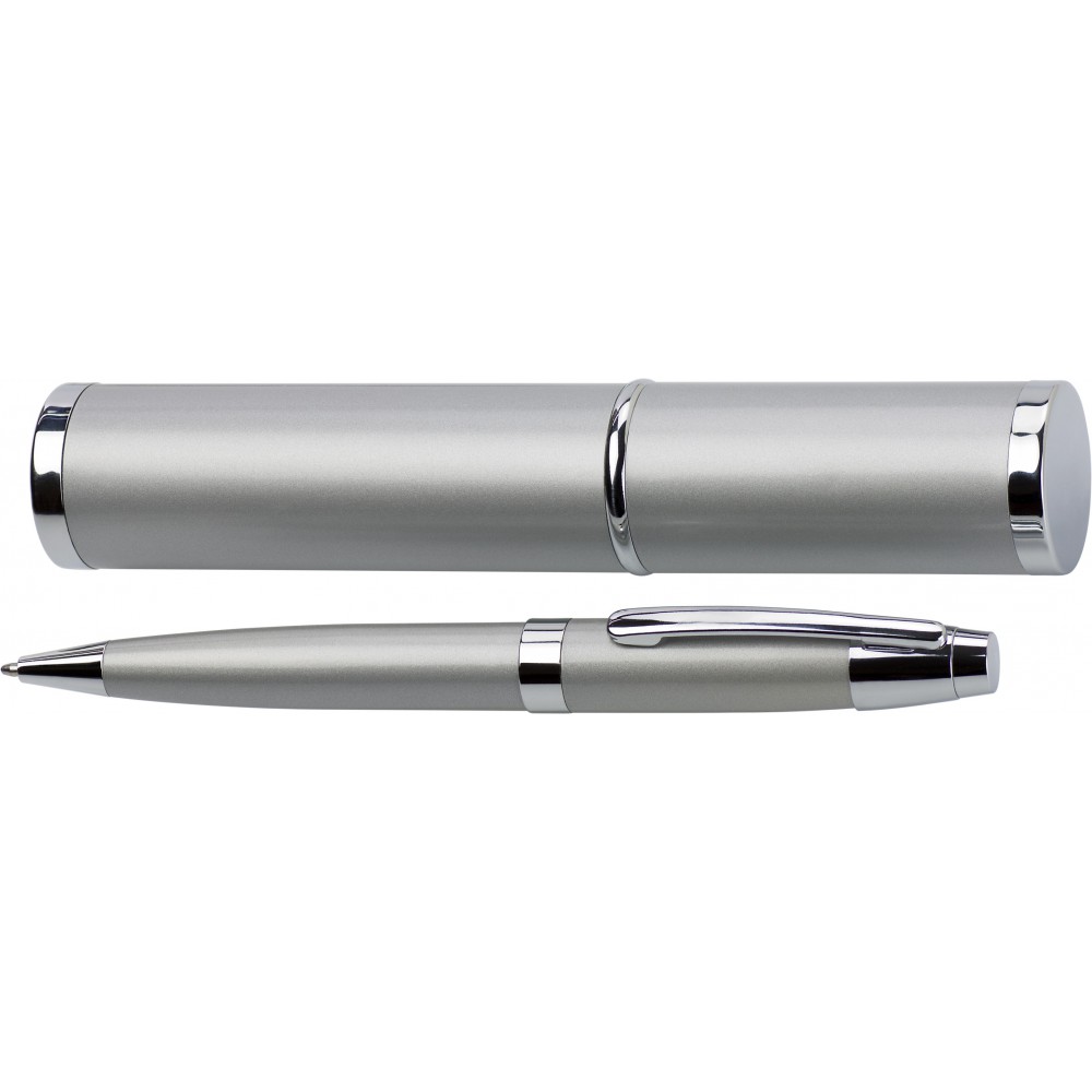 Fém golyóstoll fekete tollbetéttel, hozzáillő tokban.