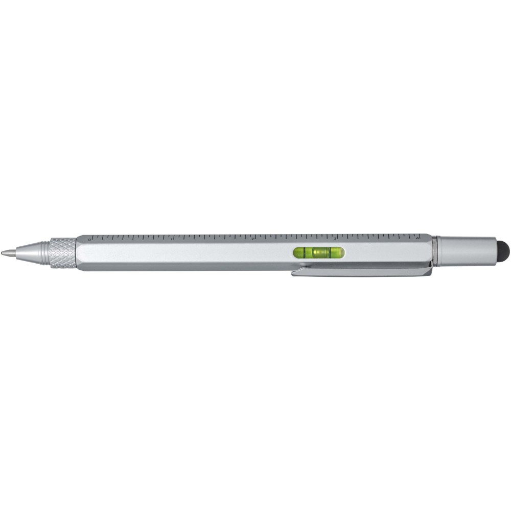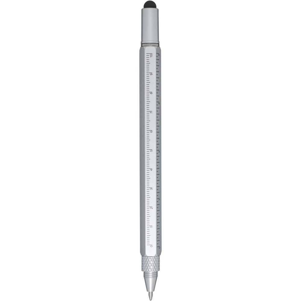 A Dora alumínium multifunkciós golyóstoll részben újrahasznosított anyagokból készült, és tartalmaz kétoldalas vonalzót, csavarhúzót, vízmértéket, valamint egy fekete gumiból készült érintőt. A tollteste újrahasznosított alumíniumból készült, ezüst spray bevonattal. A klipsz vasból, a csavarhúzó acélból, a felső rész és a hegy pedig újrahasznosított ABS anyagból készült. Fekete tollbetéttel. Írási hossz: 400 méter. Tollhegy mérete: 1,0 mm.