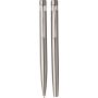 Újrahasznosított rozsdamentes acél tollkészlet, amely egy csavaros mechanikával rendelkező golyóstollat és egy rollerball tollat tartalmaz, mindkettő kék tollbetéttel érkezik. Mindkét toll hátoldalán az újrahasznosított rozsdamentes acél alapanyagot jelző logó található. Csomagolása nátronpapír díszdoboz.