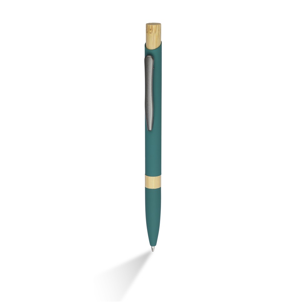 Golyóstoll újrahasznosított alumíniumból, gumírozott bevonattal, bambusz nyomógombbal és bambusz gyűrűvel a tolltesten. Kék tollbetéttel. A tollhegy vastagsága 1.0 mm, íráshossz: kb. 800 méter. Az újrahasznosított anyagra utaló logó a tollra van gravírozva.