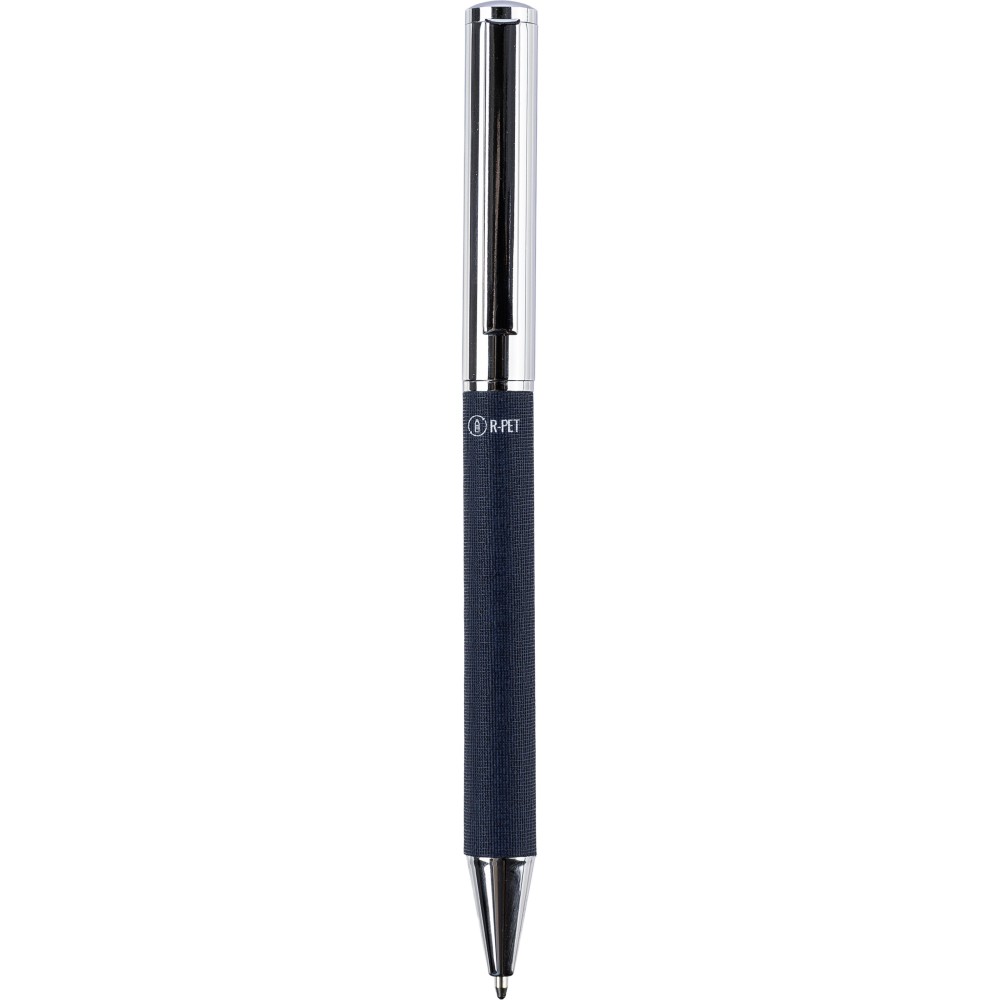 Sárgaréz és rPET csavaros golyóstoll fém klipsszel és markolattal. Csavaros mechanizmussal és rPET logóval a tolltesten. Egyenként csomagolva barna kartondobozban. Kék tintával.