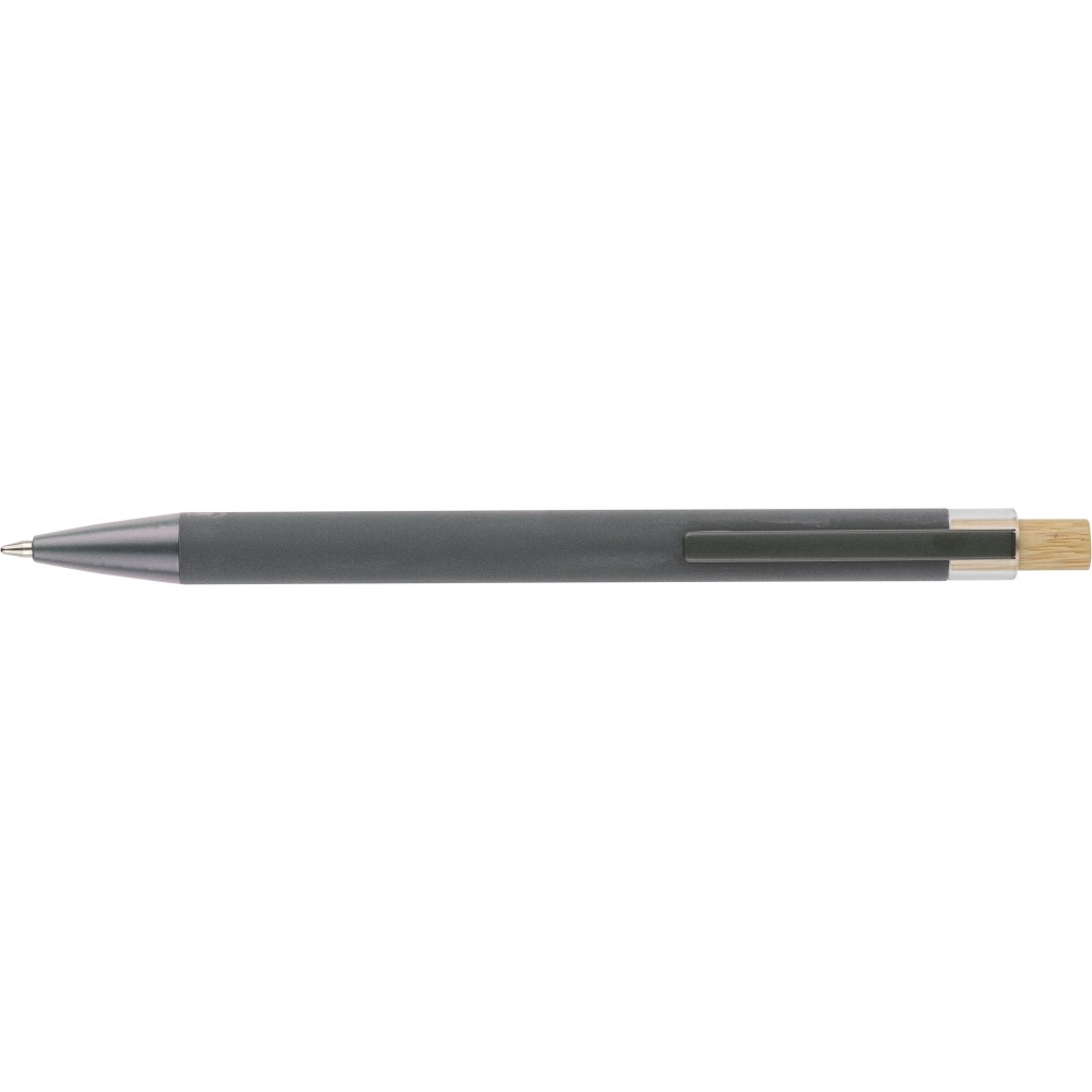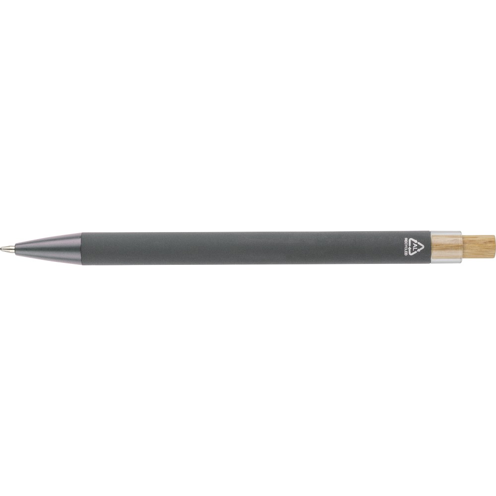 Újrahasznosított alumíniumból készült golyóstoll bambusz nyomógombbal és AS műanyag díszítéssel, fém klippel és a toll színével harmonizáló műanyag tollheggyel. A tolltesten lézergravírozott recycled (újrahasznosított) alapanyagra utaló logó található. Megközelítőleg 800 méter íráshosszúságú, kék színű tollbetéttel.