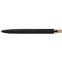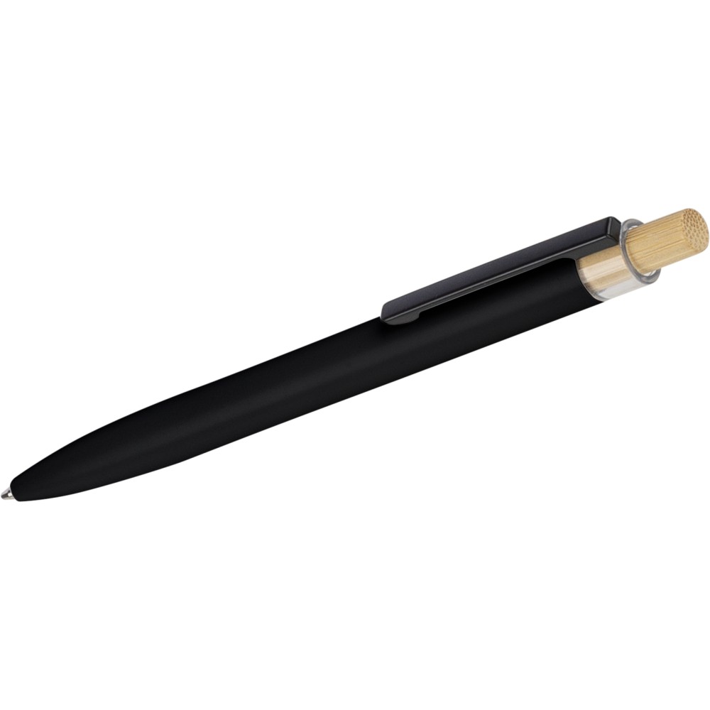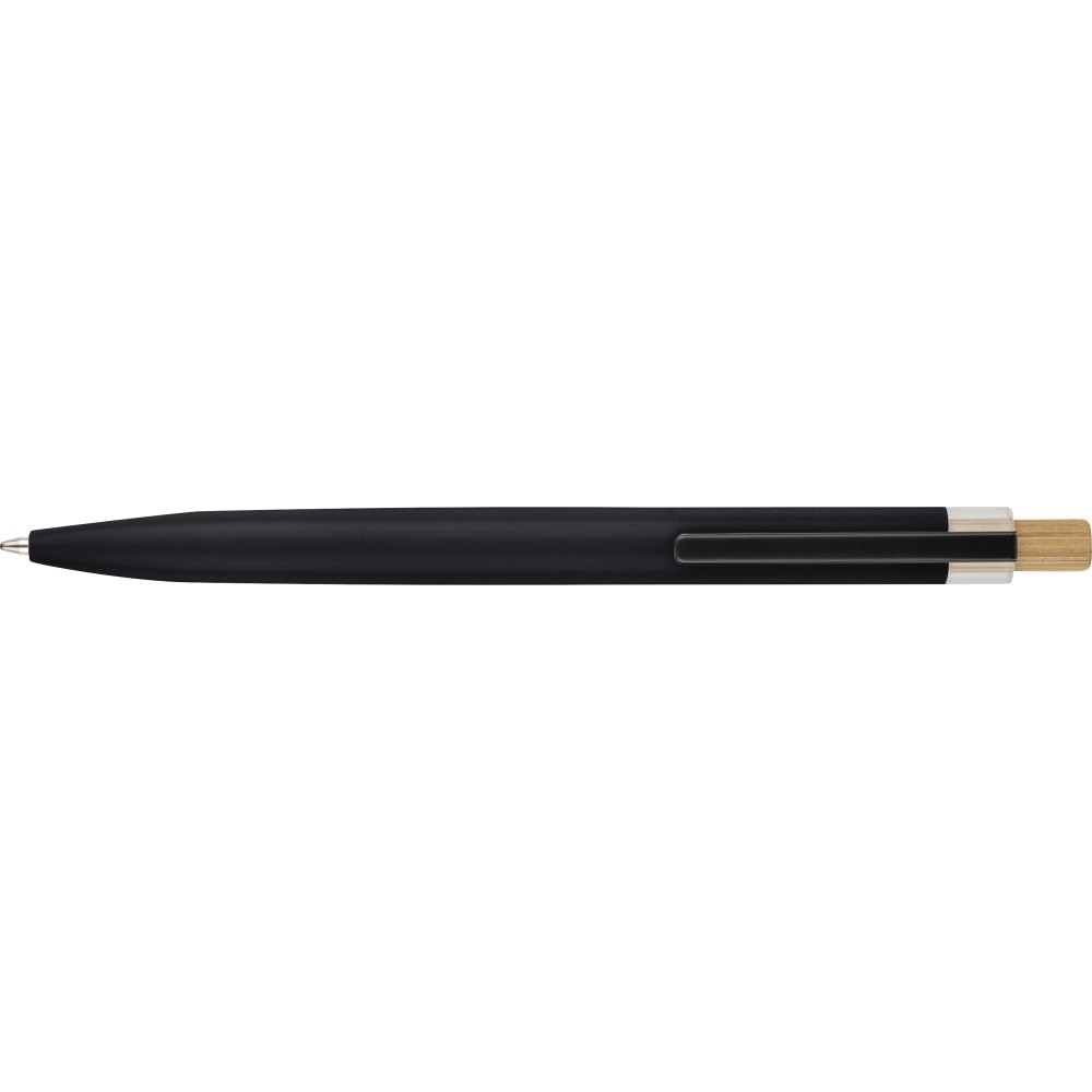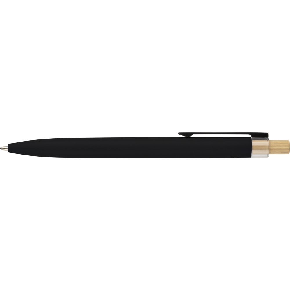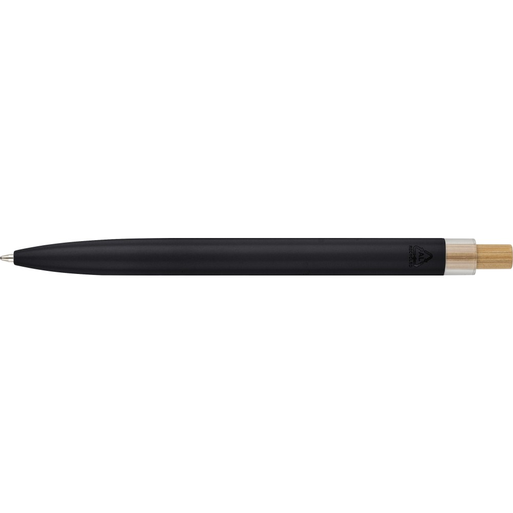 Újrahasznosított alumíniumból készült, lakkozott, nyomógombos golyóstoll bambusz nyomógombbal, rPET díszítéssel és fém klippel. A tolltesten gravírozott recycled (újrahasznosított) alapanyagra utaló logó található. Megközelítőleg 700 méter íráshossz, kék tollbetéttel.