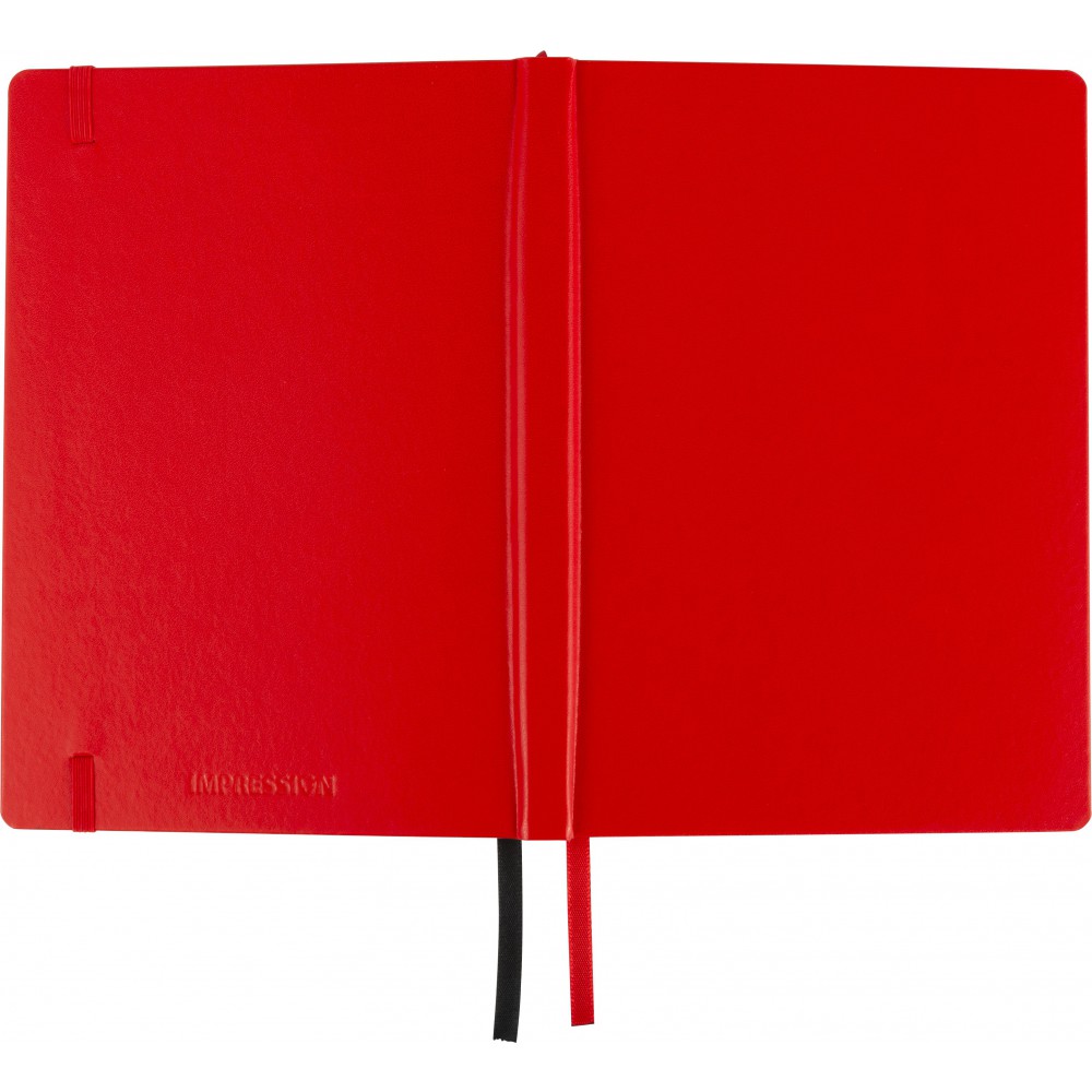 A5-ös füzet gumis záródással, 128 vonalas, dátumjelzéses lappal és papírzsebbel a hátsó, belső borítón. A külső hátsó borítón IMPRESSION logó található. PVC, 80 g papír.