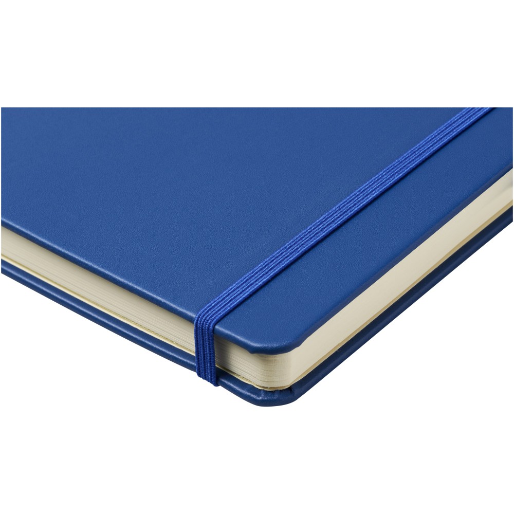 Műbőr A5-ös (14,2 cm x 21,4 cm) jegyzetfüzet gumiszalaggal, szalagjelölővel, tollhurokkal és harmonika hátsó zsebbel. 96 db vonalas krémszínű lapot tartalmaz (80 g/m2).