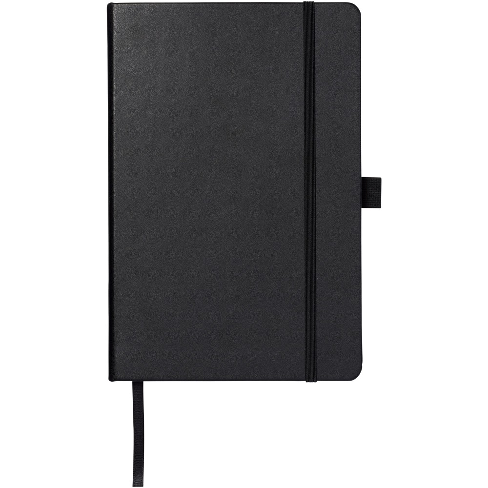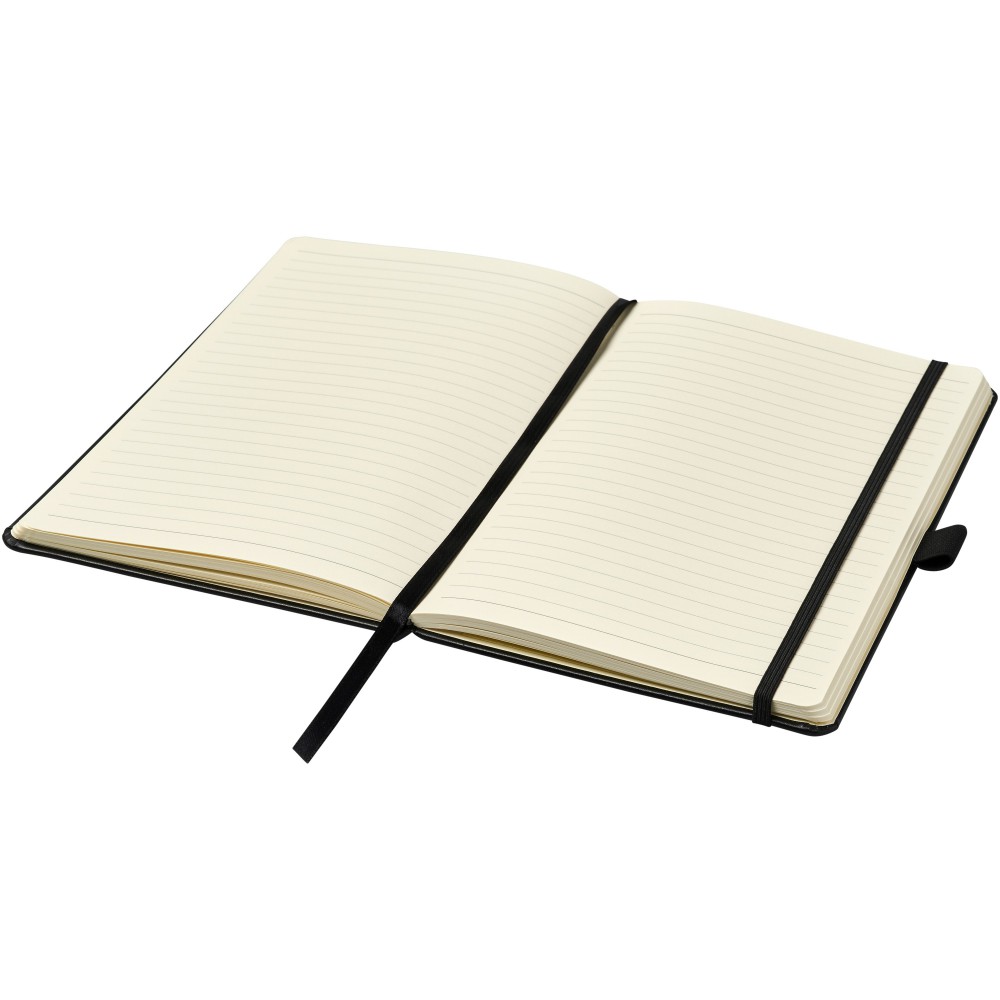 Műbőr A5-ös (14,2 cm x 21,4 cm) jegyzetfüzet gumiszalaggal, szalagjelölővel, tollhurokkal és harmonika hátsó zsebbel. 96 db vonalas krémszínű lapot tartalmaz (80 g/m2).