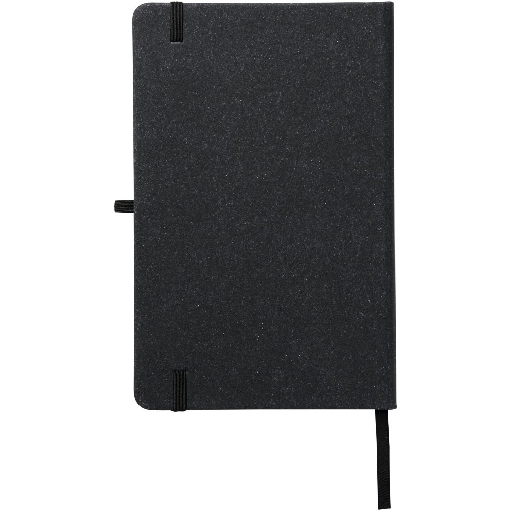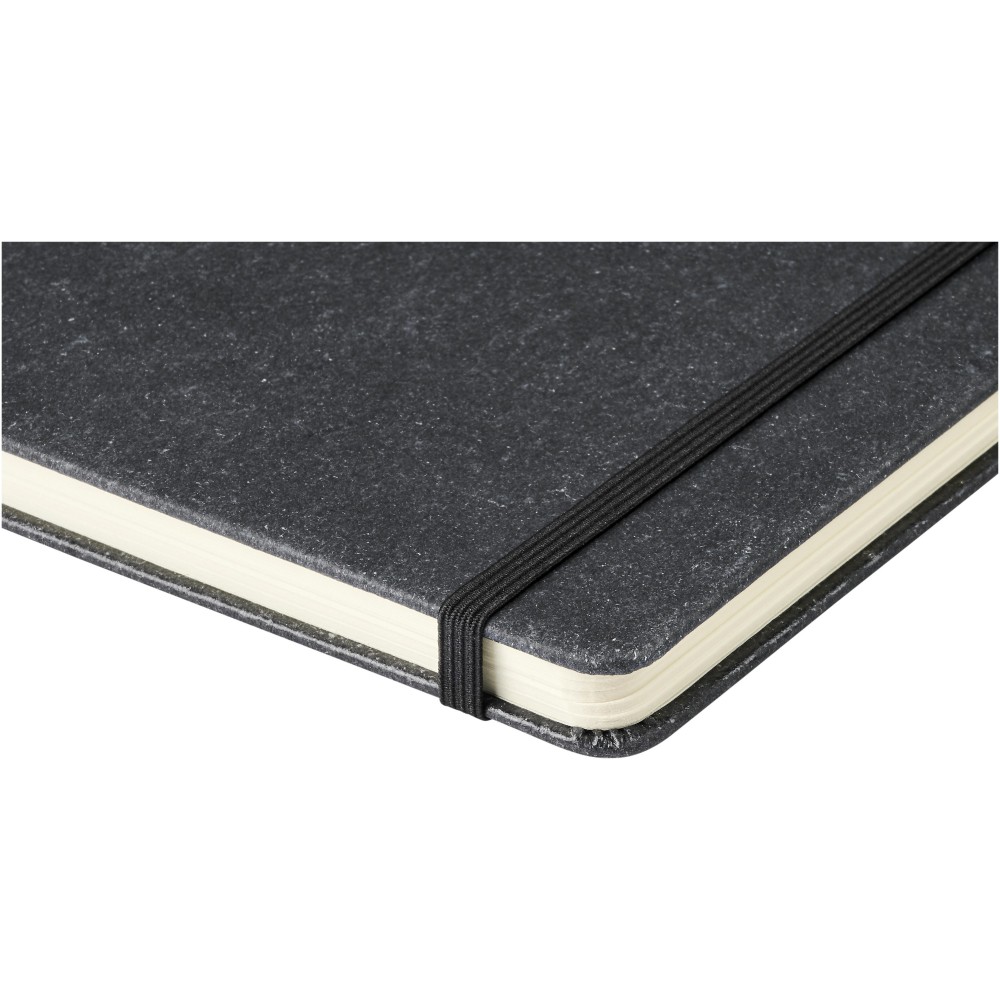 A5 méretű füzet, újrahasznosított bőr borítással. Gumi zárószalaggal, tollhurokkal, könyvjelzővel és 80 (80gsm) vonalas lappal.