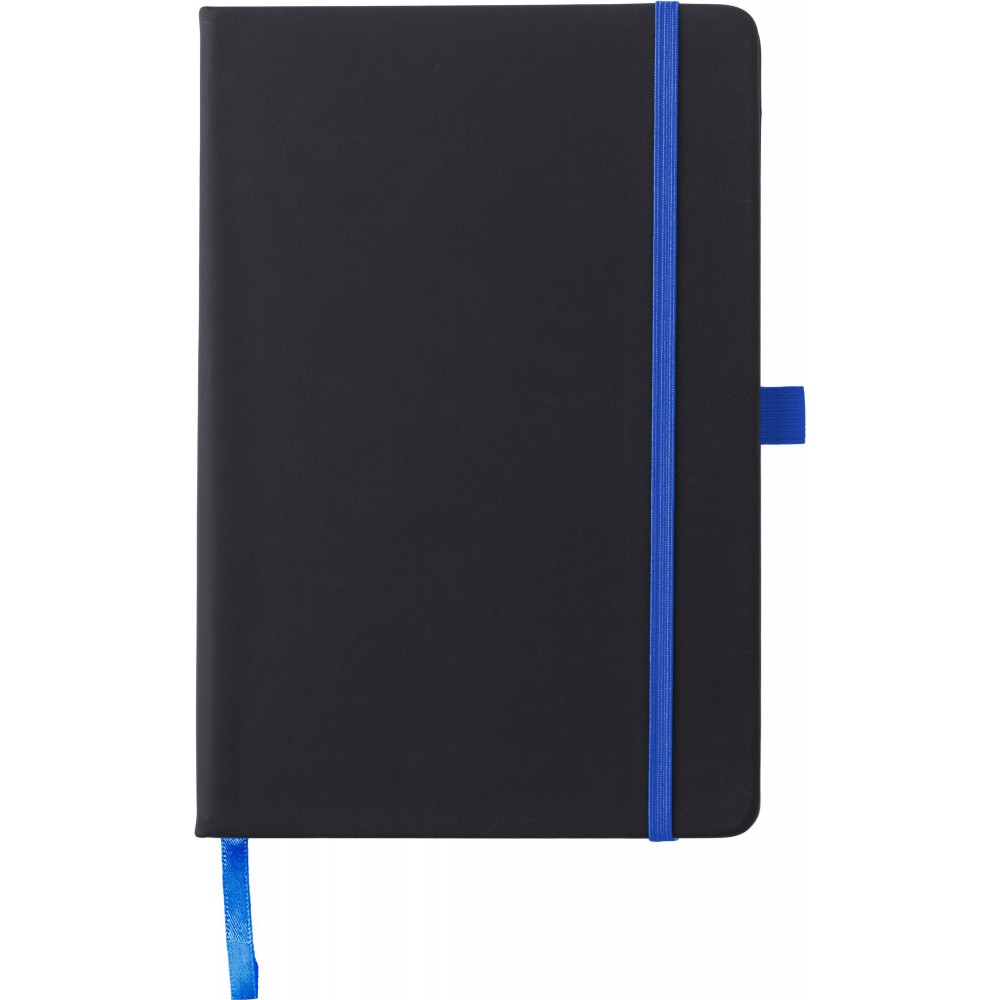 A5 füzet 96 vonalas lappal, könyvjelzővel, gumis zárópánttal. Lézergravírozás után a gravírozott felület színe megegyezik a gumipánt színével. PU anyag.