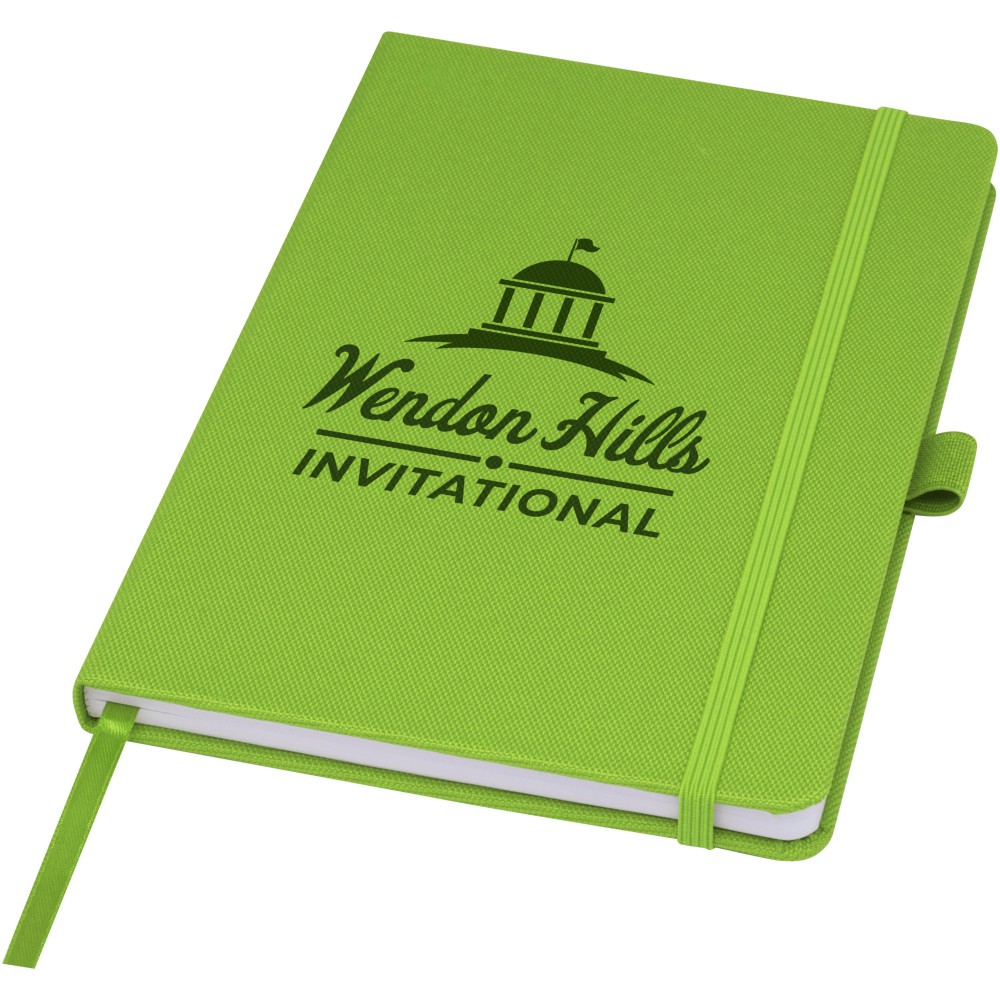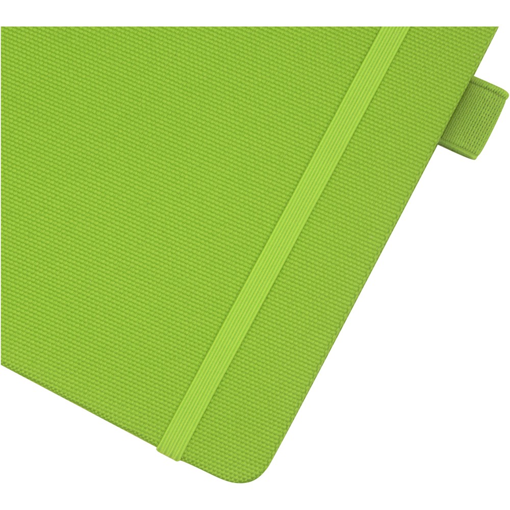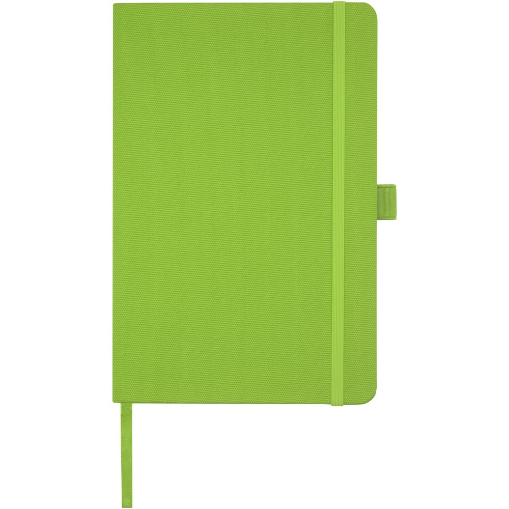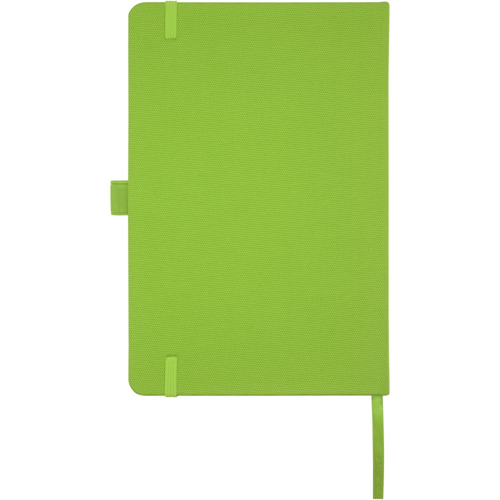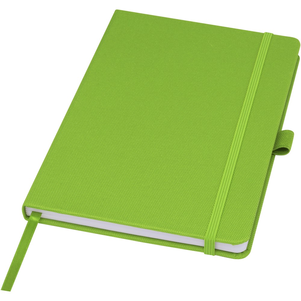 A5 jegyzetfüzet újrahasznosított PET műanyagból készült szövet borítóval. 80 lap 70 g/m2 újrahasznosított, vonalas papír, tolltartó hurok és szalag könyvjelző. Kombinálható a 107757 Honua RPET golyóstollal.