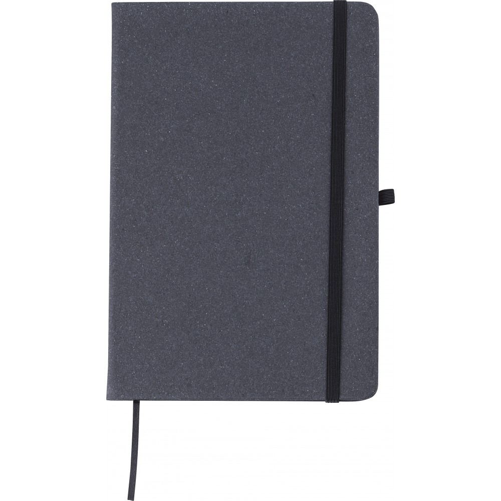 Újrahasznosított bőrből készült A5-ös jegyzetfüzet 100 vonalas lappal. Gumis záródás, tollhurok és könyvjelző szalag. Hátoldalán az újrahasznosított anyagra utaló logónyomat látható.