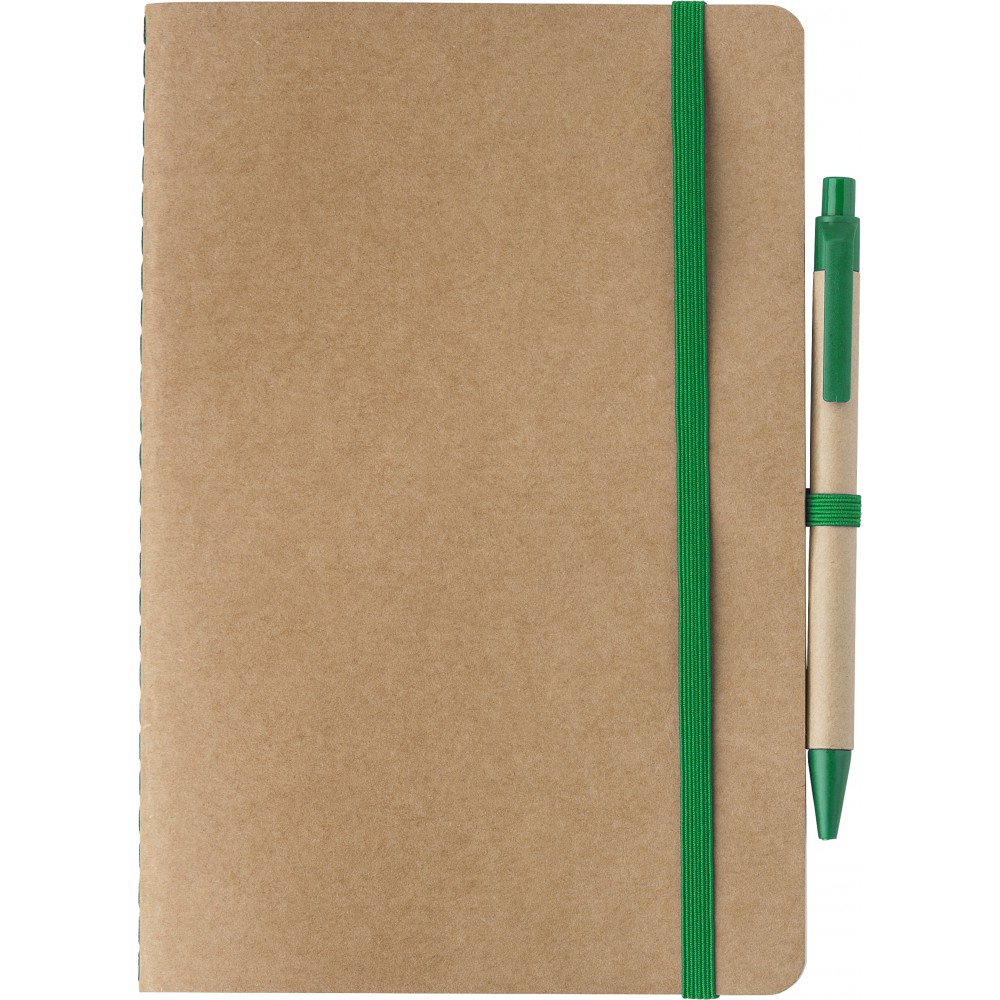 Újrahasznosított karton jegyzetfüzet 60 sima lappal. Tartalmazza a hozzáillő karton/szalma tollat kék tollbetéttel. Gumis összefogó pánt és tollhurok.