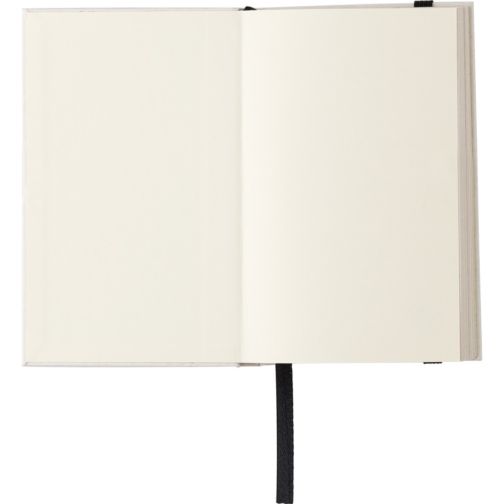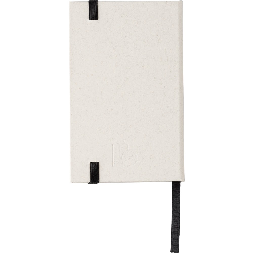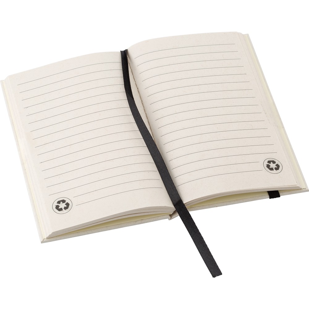 Újrahasznosított tejesdobozból készült A6-ös jegyzetfüzet 80 lappal, gumiszalaggal és könyvjelzővel. 70%-ban újrahasznosított tejeskartonból és 30%-ban újrahasznosított papírból készült. Igazolóbélyegző a füzet hátuljának az alján.