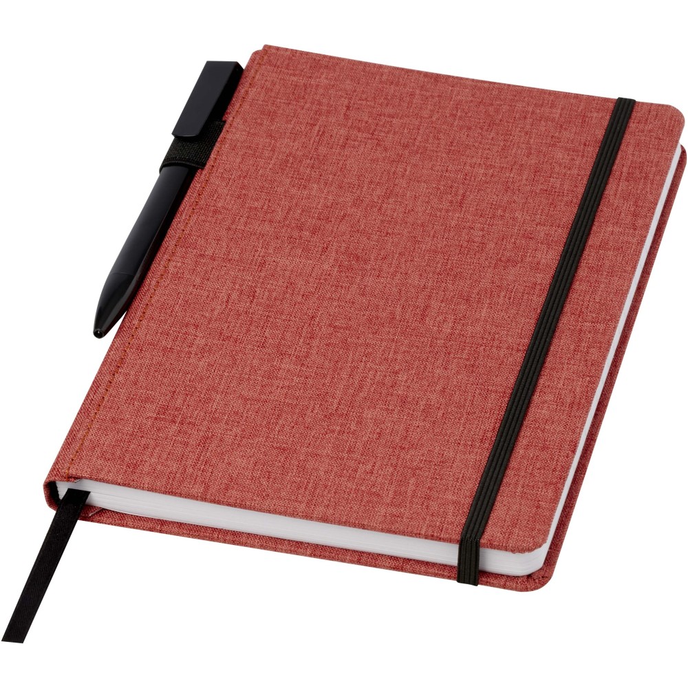 A5 méretű füzet tollhurokkal és könyvjelzővel, RPET polietilén szövetből. 96 lap 70 g / m2 újrahasznosított vonalas lap. Csomagolás: karton palást. Újrahasznosított műanyag, újrahasznosított papír.