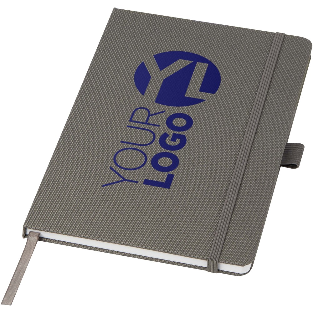 A5 jegyzetfüzet újrahasznosított PET műanyagból készült szövet borítóval. 80 lap 70 g/m2 újrahasznosított, vonalas papír, tolltartó hurok és szalag könyvjelző. Kombinálható a 107757 Honua RPET golyóstollal.