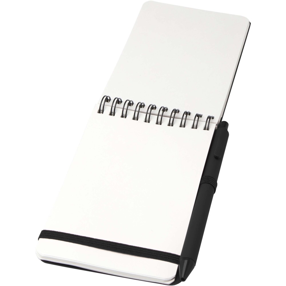 Thalaasa A6 keményfedeles jegyzetfüzet óceánból származó újrahasznosított műanyagból készült, és 80 vonalas, 70 g/m2 krémszínű lapot tartalmaz. A jegyzetfüzet lekerekített sarkokkal, elasztikus zárással és tolltartóval rendelkezik. A fekete tintával író golyóstoll szintén óceánból származó újrahasznosított műanyagból készült. Íráshossz: 1000 méter. Tollhegy mérete: 1,0 mm.