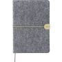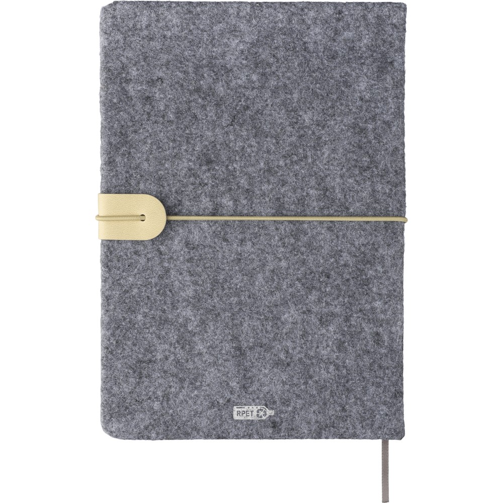 Újrahasznosított filcből készült jegyzetfüzet, kb. A5-ös méretű, 80 lapos. Puha tapintású kemény borítóval, gumiszalaggal és kívül PU zárópánttal. Szalagos könyvjelzővel és 70 g/m2-es vonalas papírral. A hátoldalán lézergravírozott újrahasznosított logóval.