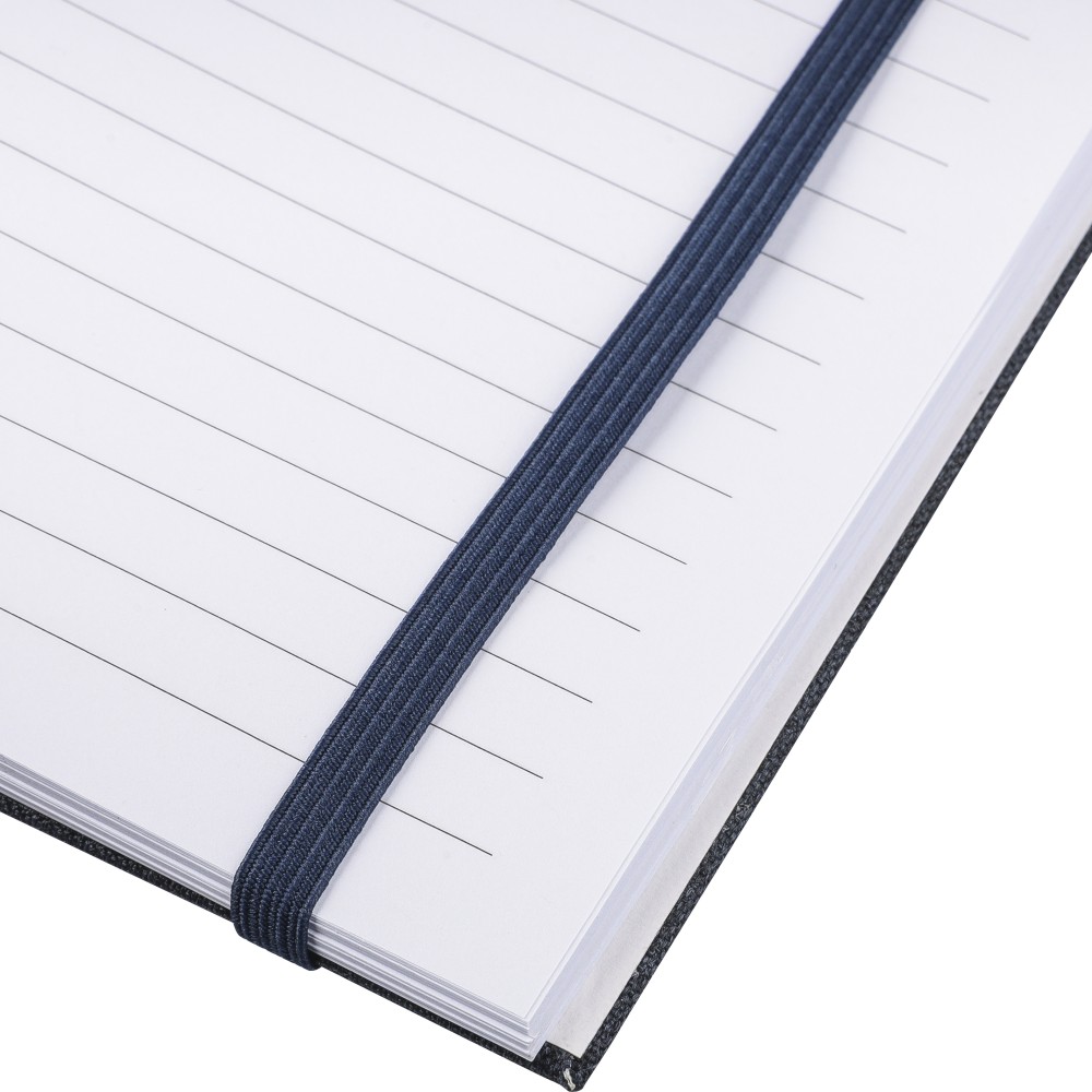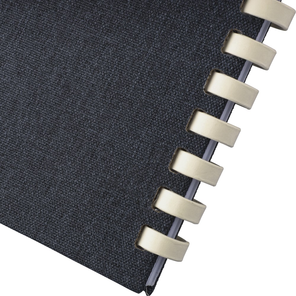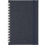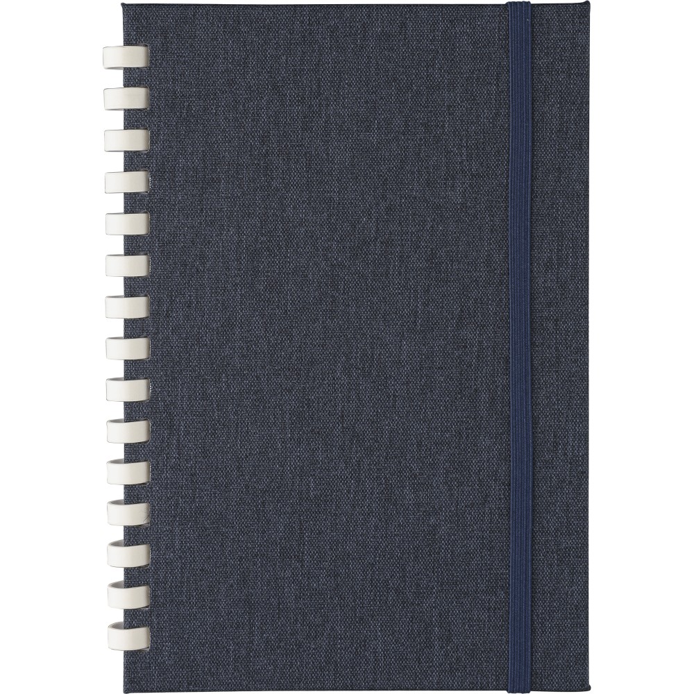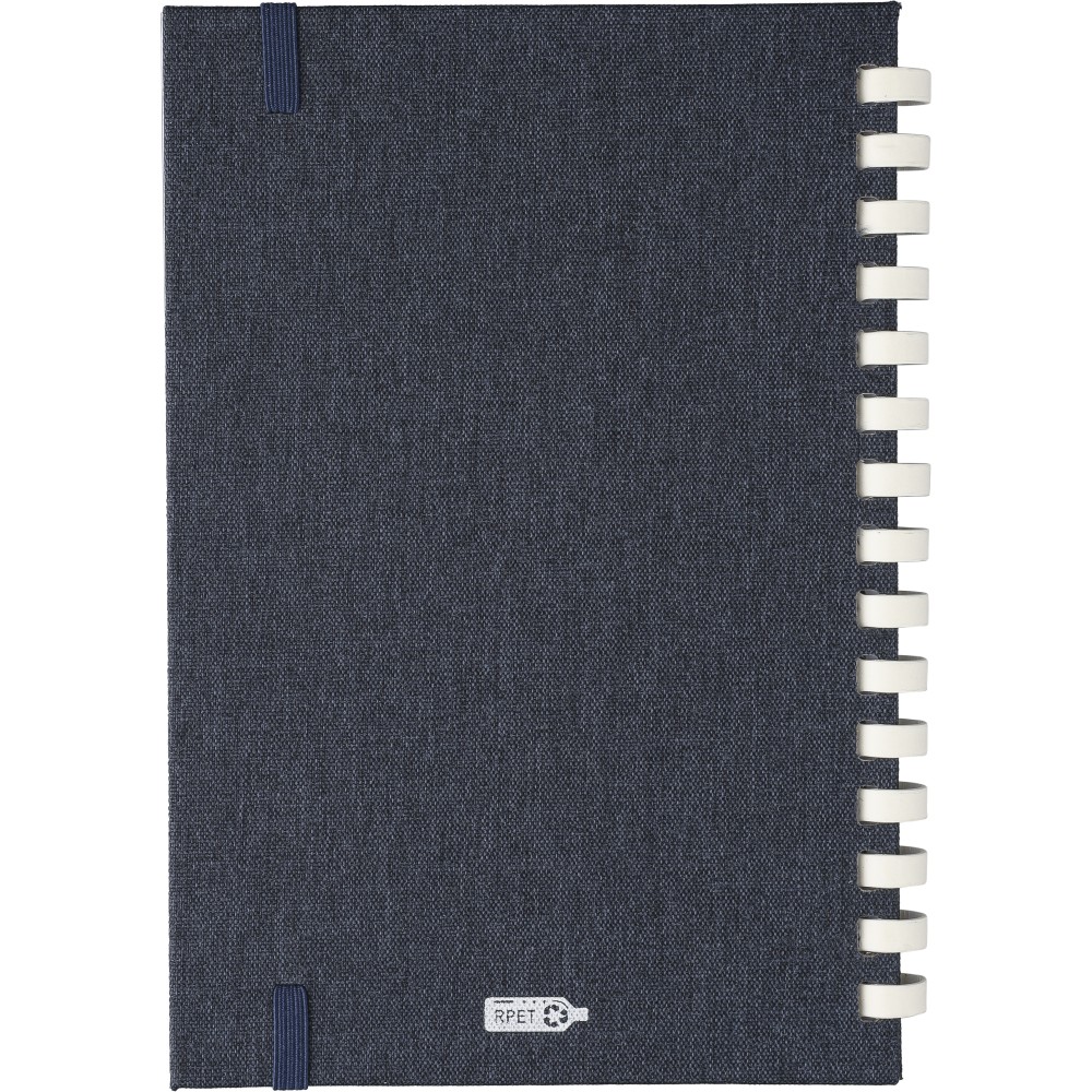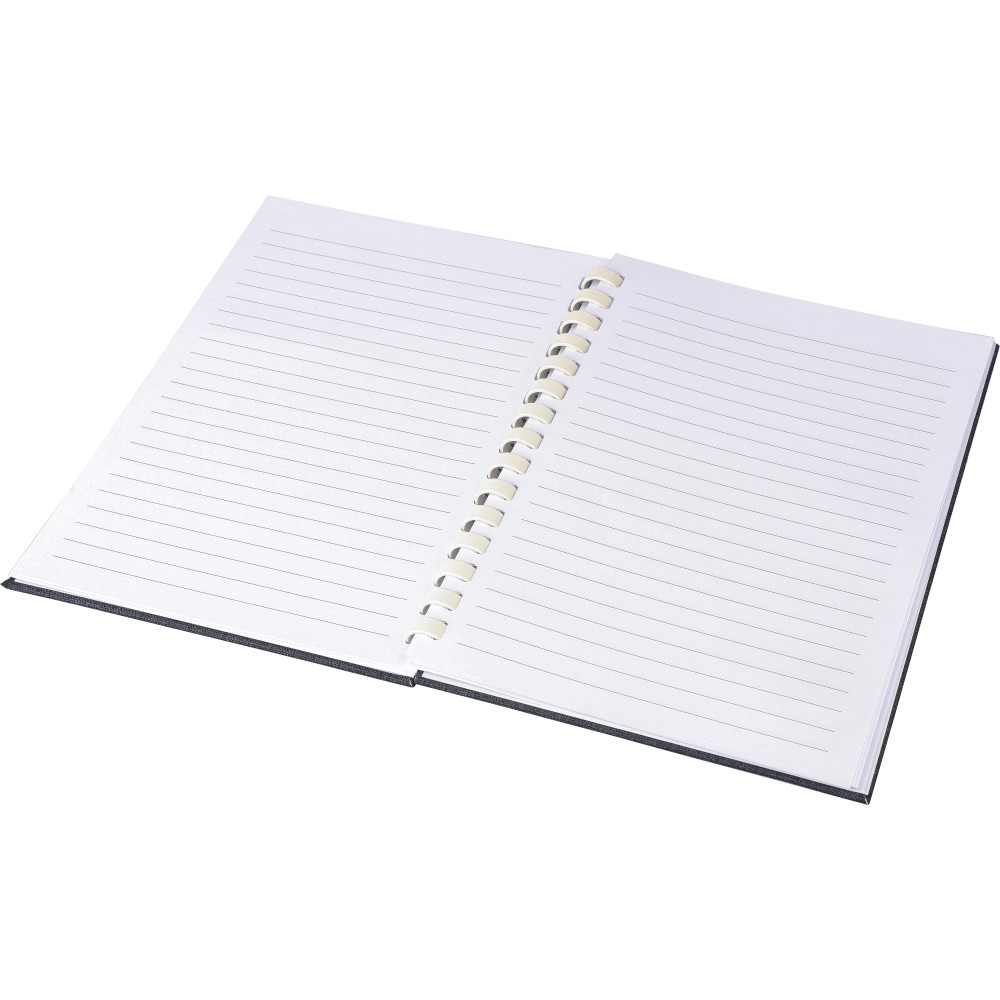 rPET jegyzetfüzet, kb. A5-ös méretű, 80 lapos. Kemény borítóval és rugalmas zárópánttal. Fehér karton spirállal (15 karikás), szalagos könyvjelzővel és 70 g/m2-es vonalas papírral. A hátoldalon rPET logóval. Selyempapírba csomagolva, nejlonzacskó nélkül.