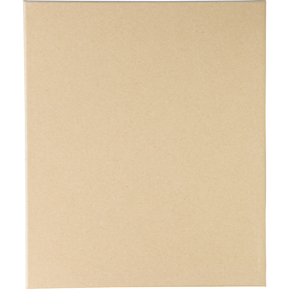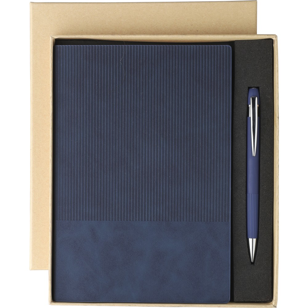 Újrahasznosított PU jegyzetfüzet és golyóstoll szett. A jegyzetfüzet kb. A5-ös méretű, 100 lapos, 80 g/m2-es vonalas lapokkal és szalagos könyvjelzővel, kordbársony hatású borítóval és dombornyomott újrahasznosított logóval rendelkezik. A golyóstoll gumírozott felülettel, csíkos markolattal, krómozott heggyel és lézergravírozott újrahasznosított logóval rendelkezik. Erős barna kartondobozban, EVA betéttel. Kék tintával szállítjuk.